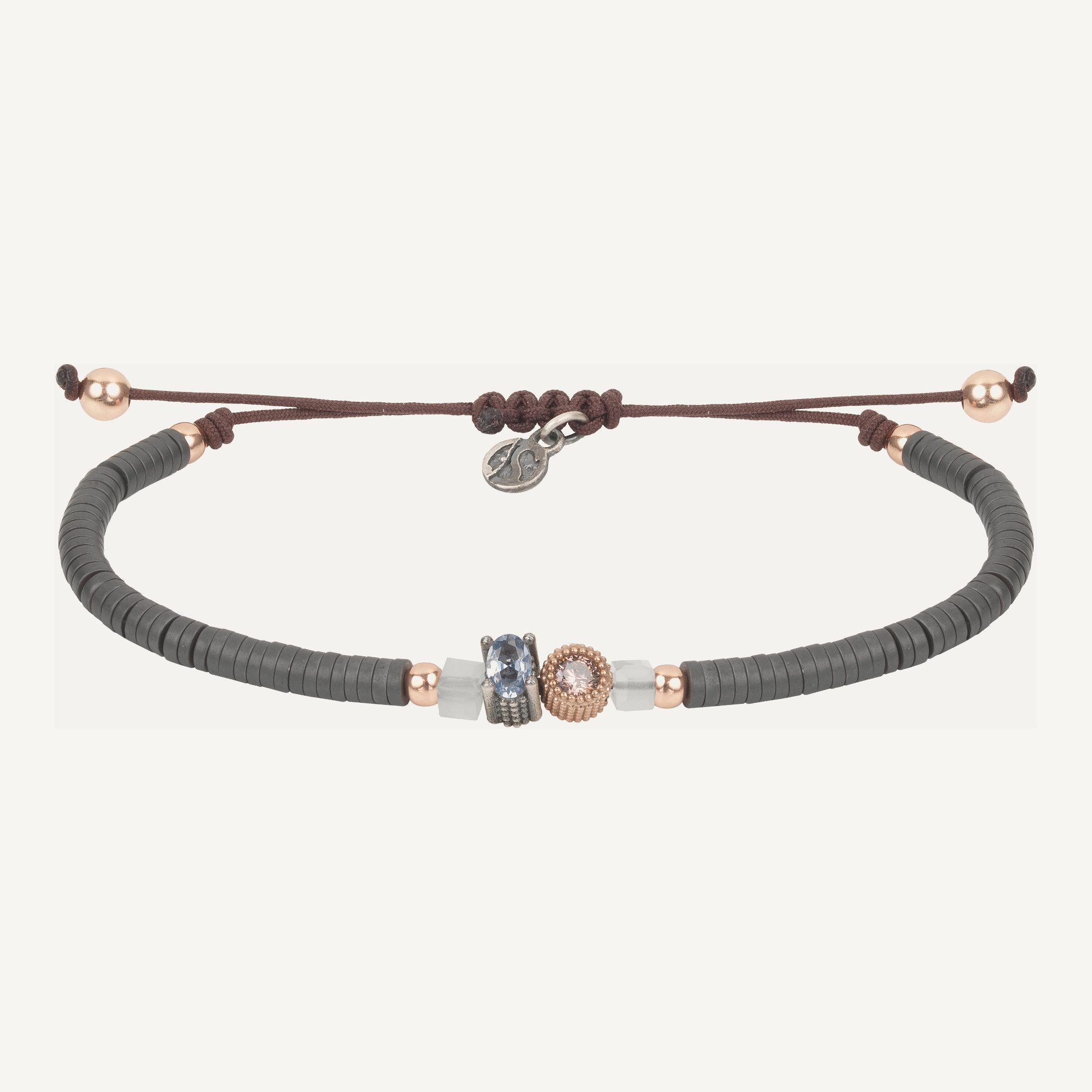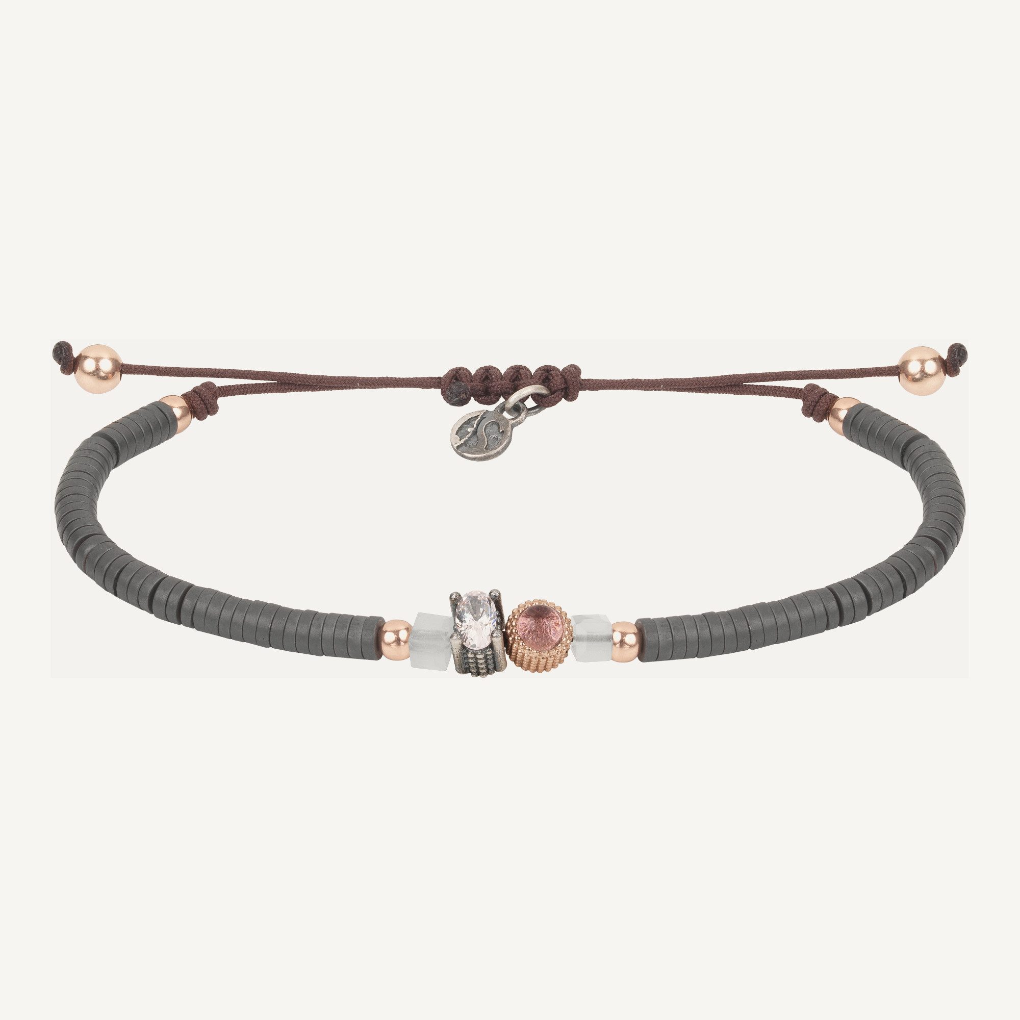 Bracelet en argent 925 avec finition antique, quartz rose, zircons et nylon.