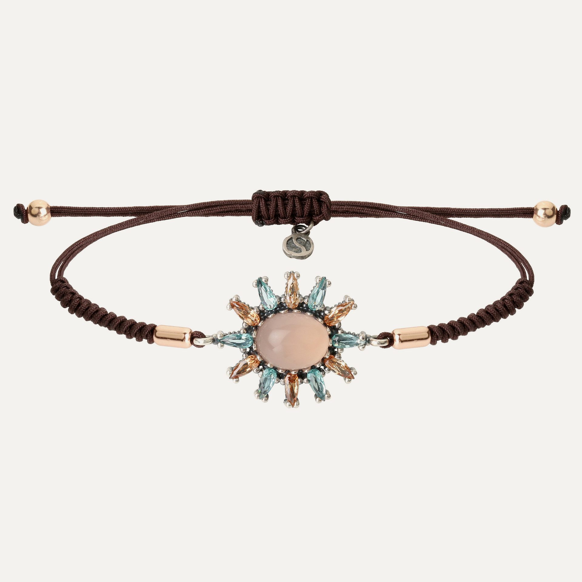 Bracelet en argent 925, quartz, zircons et nylon. Deux couleurs au choix : quartz rose ou quartz fumé.