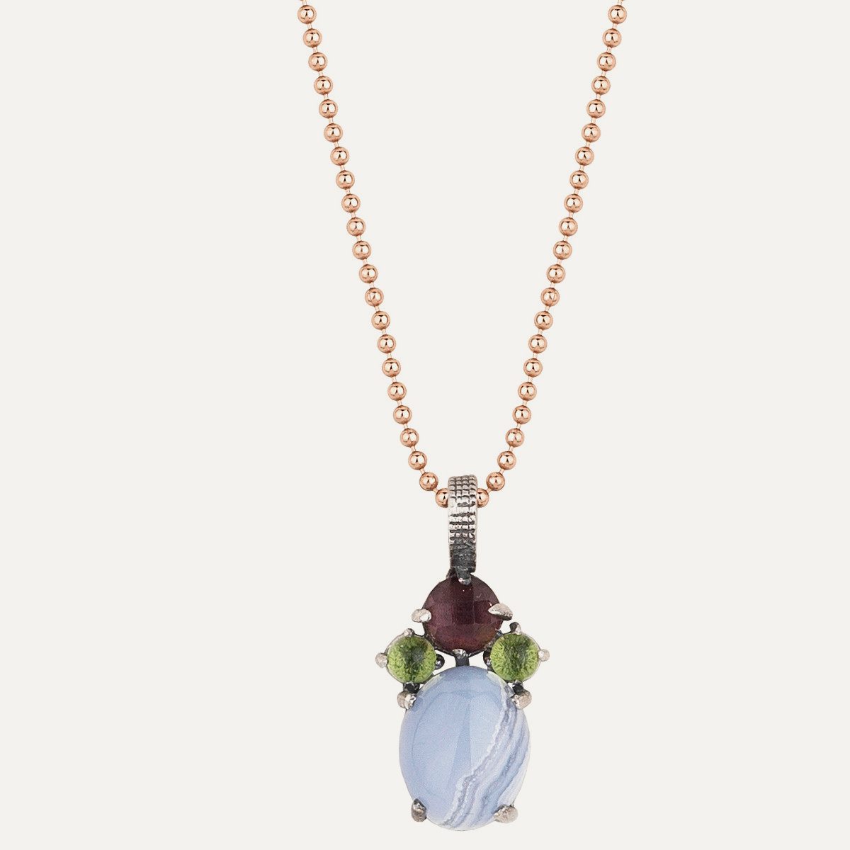 Pendentif en argent 925 avec finition antique, tourmaline rose, péridot et agate bleue.