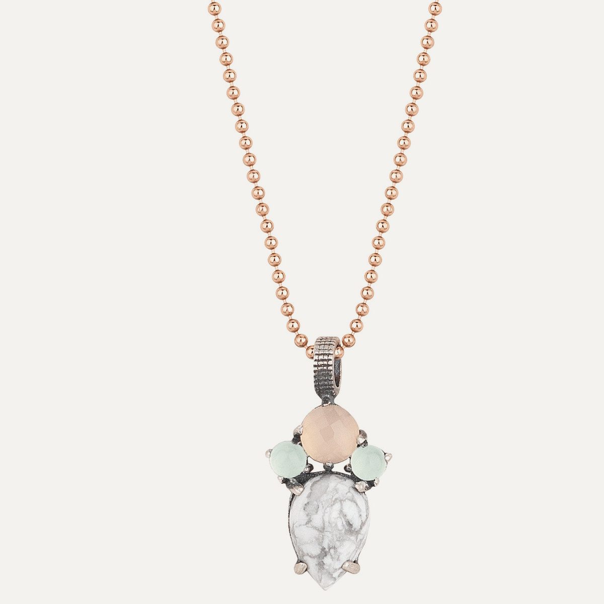 Pendentif en argent 925 avec finition antique, quartz rose, calcédoine et howlite.