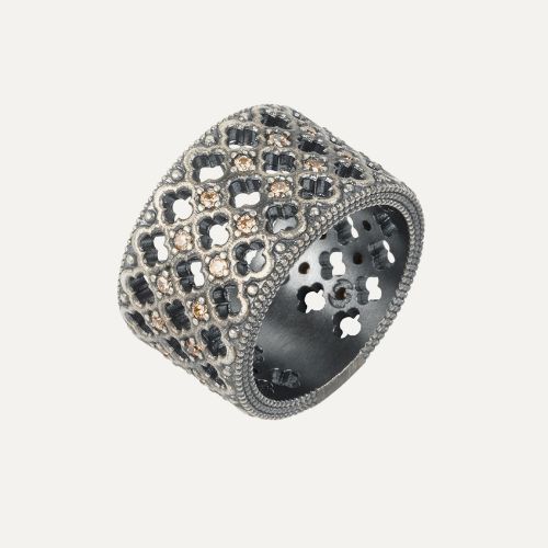 Bague en argent 925 avec une finition antique et des zircons cava sertis dans un délicat motif ajouré.
