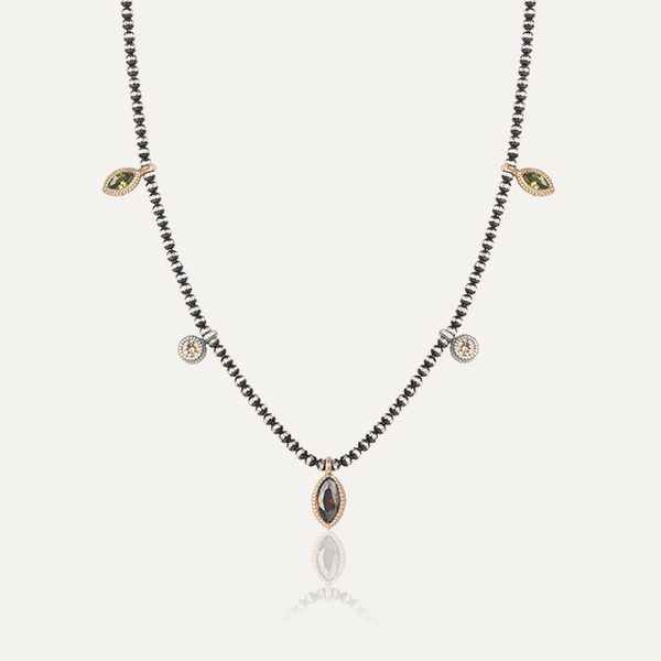 Collier en argent 925 avec placage en or rose 24kt, perles noires et zircons verts, blancs et noirs.