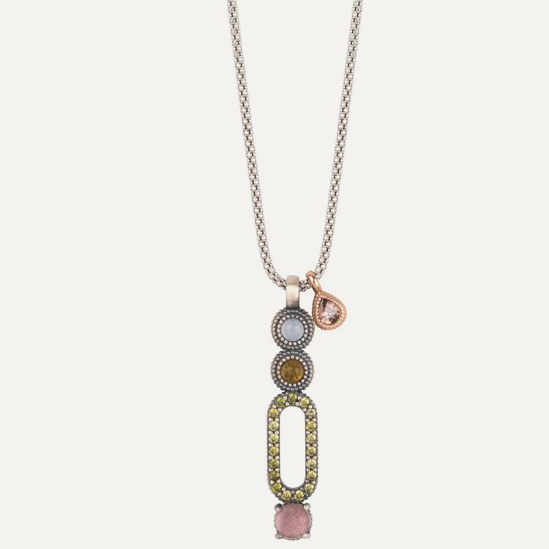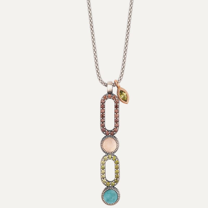 Pendentif en argent sterling, quartz rose, agate, hématite, zircon et nylon.