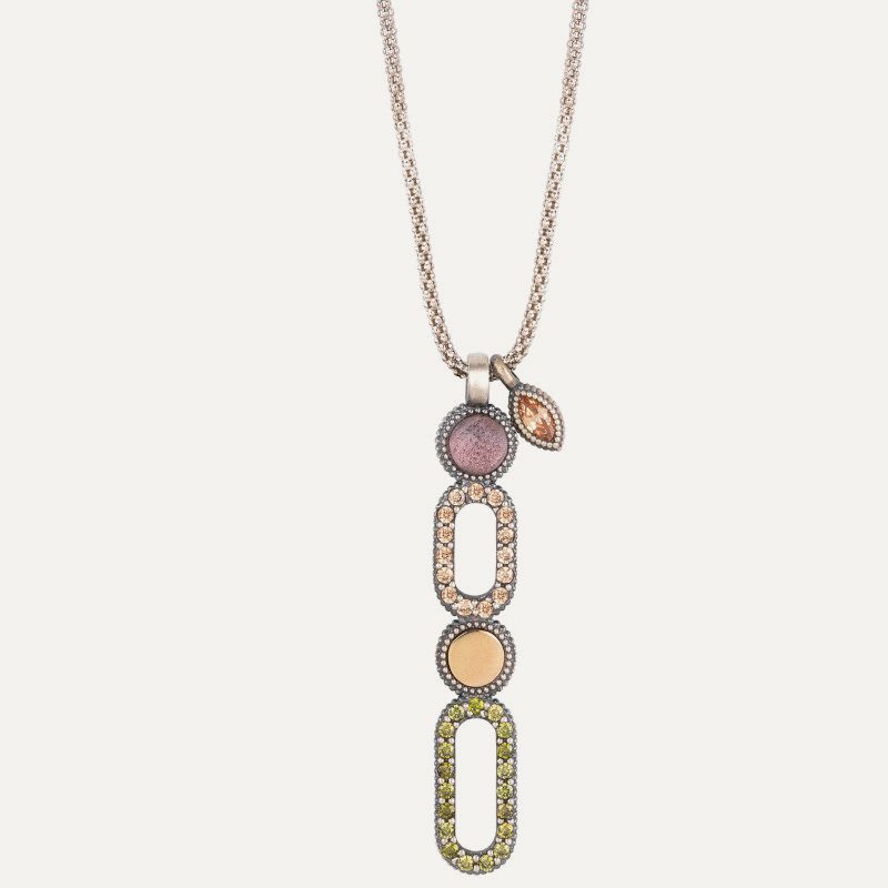 Pendentif en argent sterling, agate, hématite, zircone, cristal et nylon.