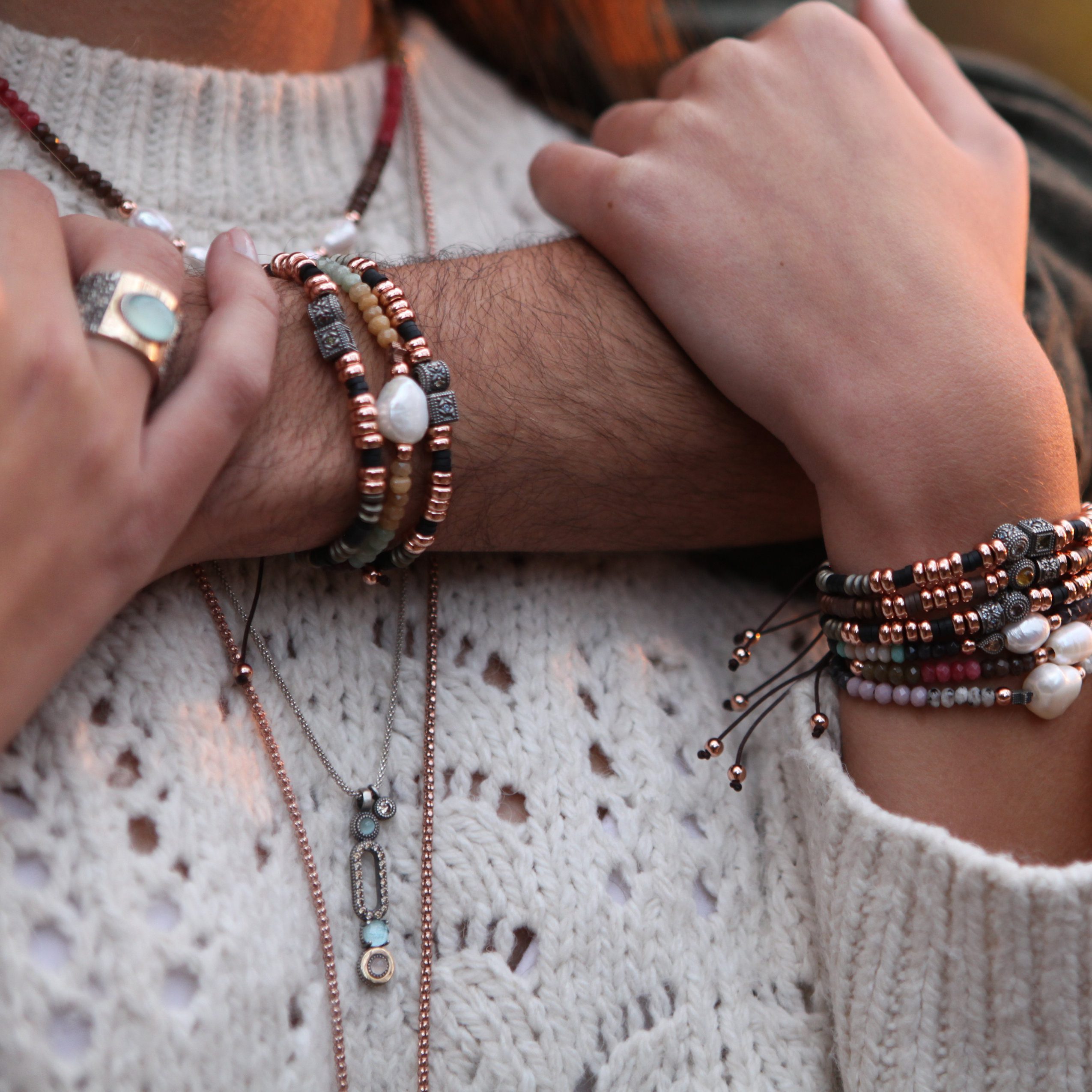 Bracelet réglable en fil brun avec perles colorées, pièce centrale en argent 925 plaqué or avec zircon et cabochon rose.