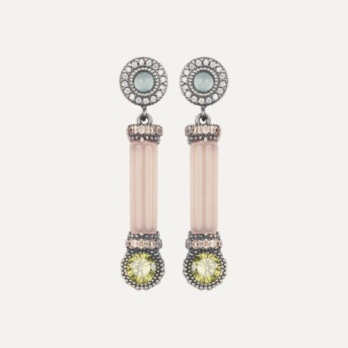 Longues boucles d'oreilles en argent 925 avec finition antique, calcédoine bleue, cylindre de quartz rose et zircon cubique dans les tons cava et ver...
