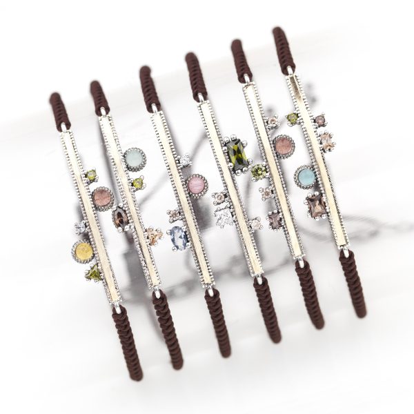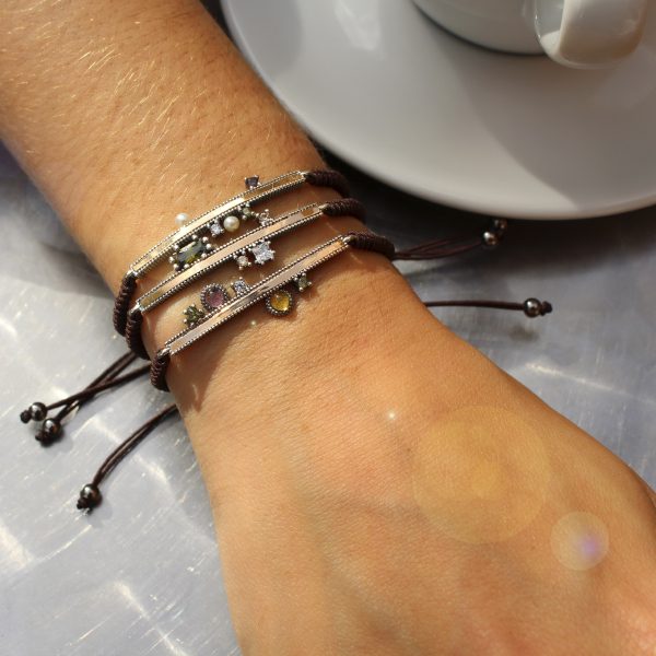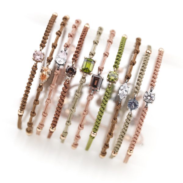 Bracelet en argent 925 avec zircons et nylon, en 6 couleurs au choix et deux finitions possibles : argent antique ou plaqué or rose 24kt.