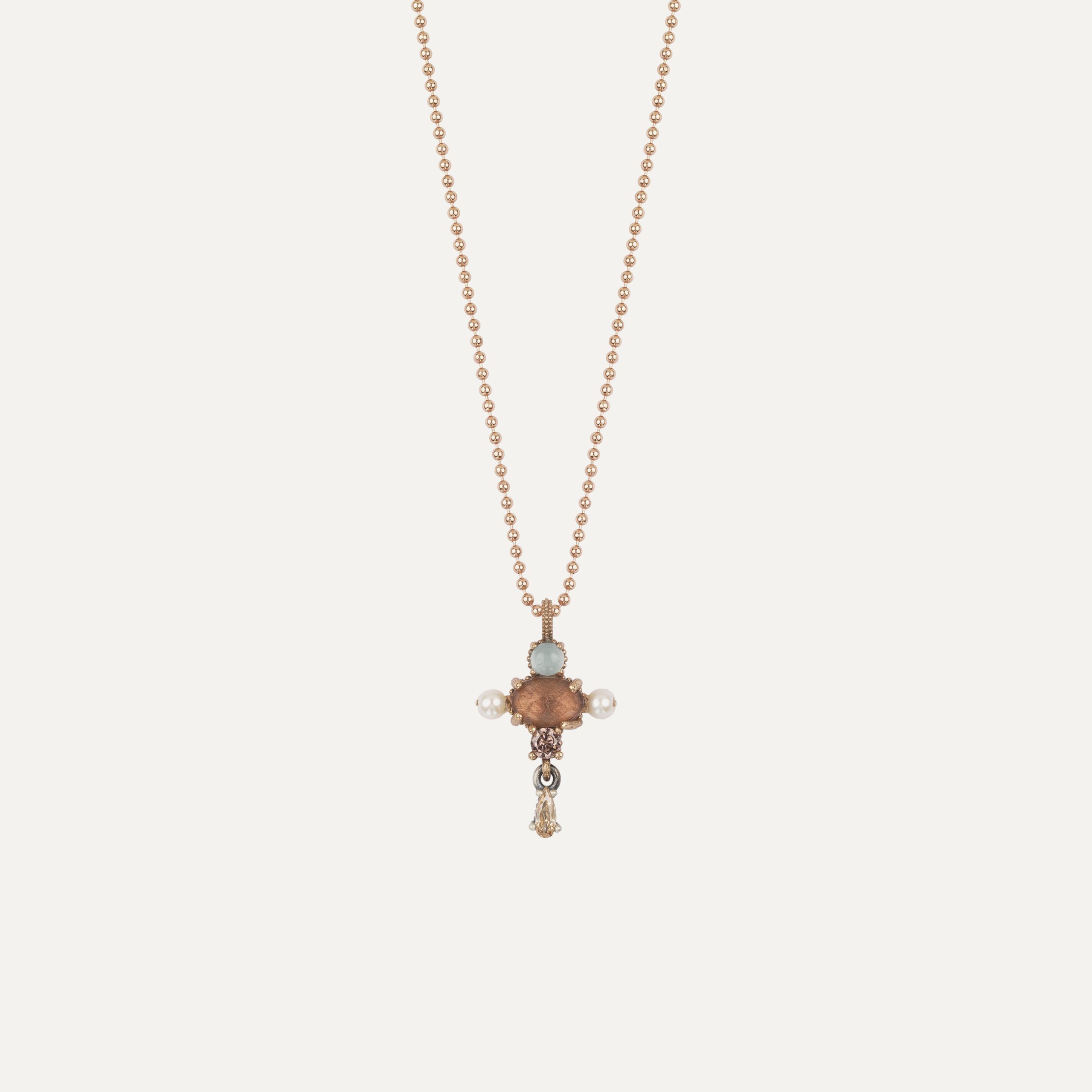 Pendentif en argent 925 avec placage en or rose 24kt, tourmaline rose, calcédoine verte, perles baroques et zircons.