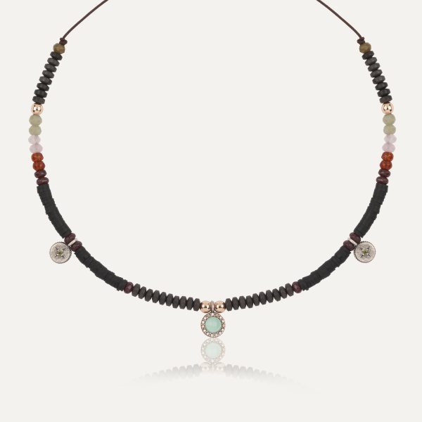 Pendentif en argent 925, calcédoine, zircone, perles de verre, hématite, caoutchouc et nylon.