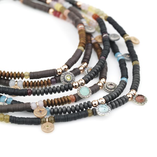 Bracelet en argent 925 avec or 9kt, calcédoine, perles de verre, hématite, caoutchouc et nylon.