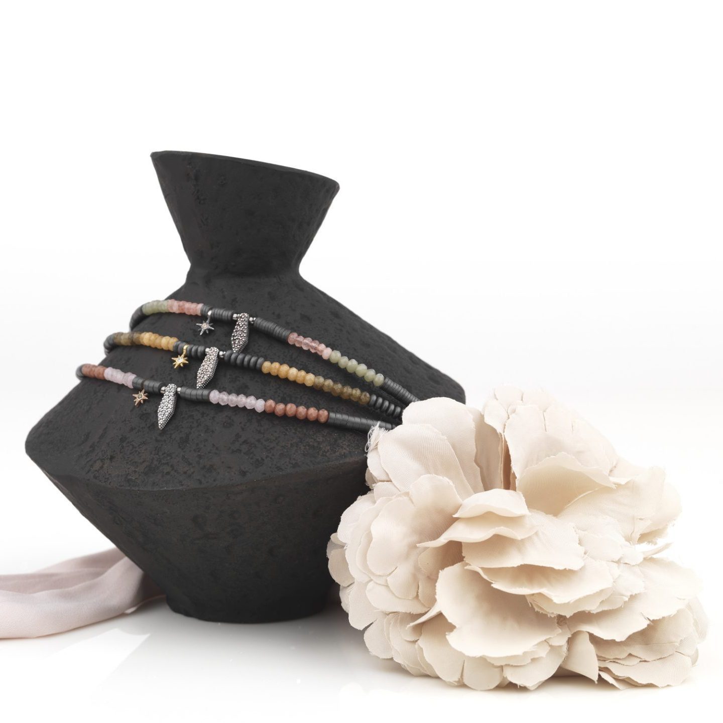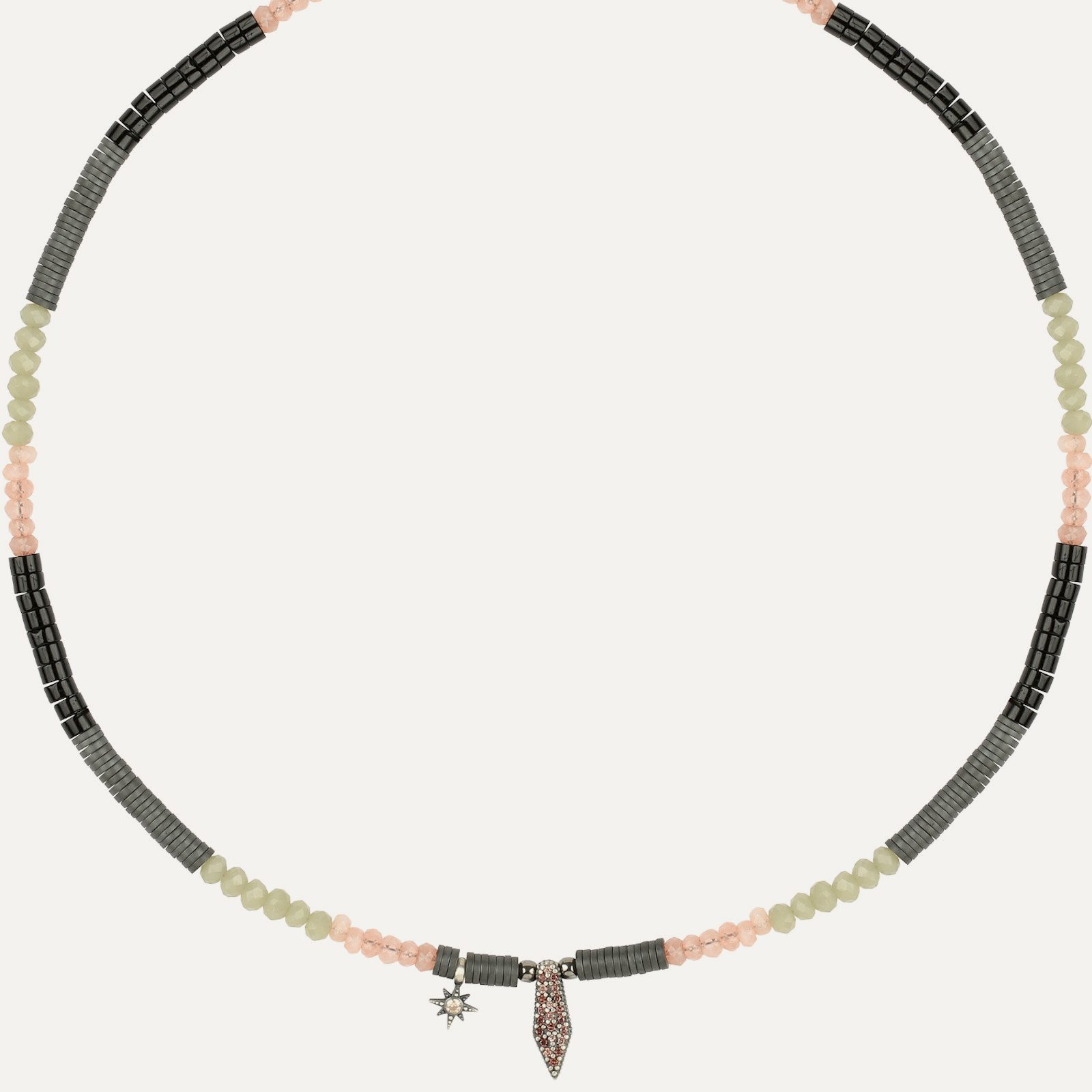 Pendentif en argent 925, agates, onyx, perles de verre, hématite, zircon et acier. Disponible en trois combinaisons de couleurs.