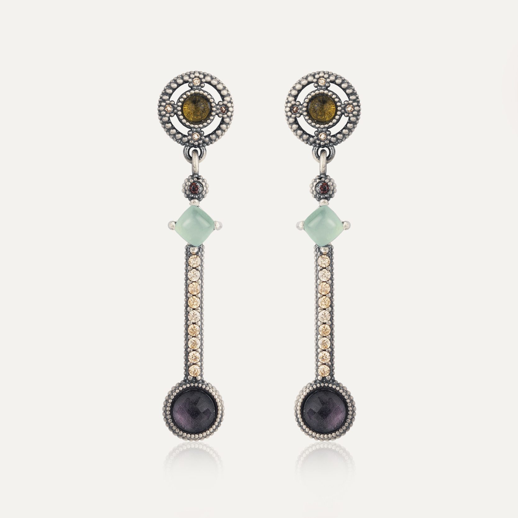 Boucles d'oreilles en argent 925 avec finition antique, citrine, calcédoine, tourmaline et zircone.