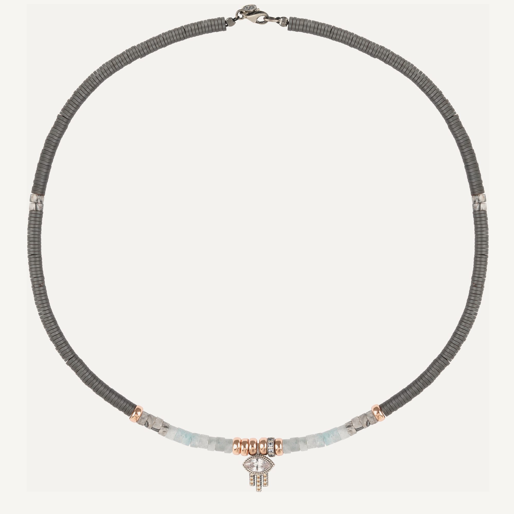 Pendentif en argent 925, quartz gris, jaspe gris et noir, zircone, hématite et acier.