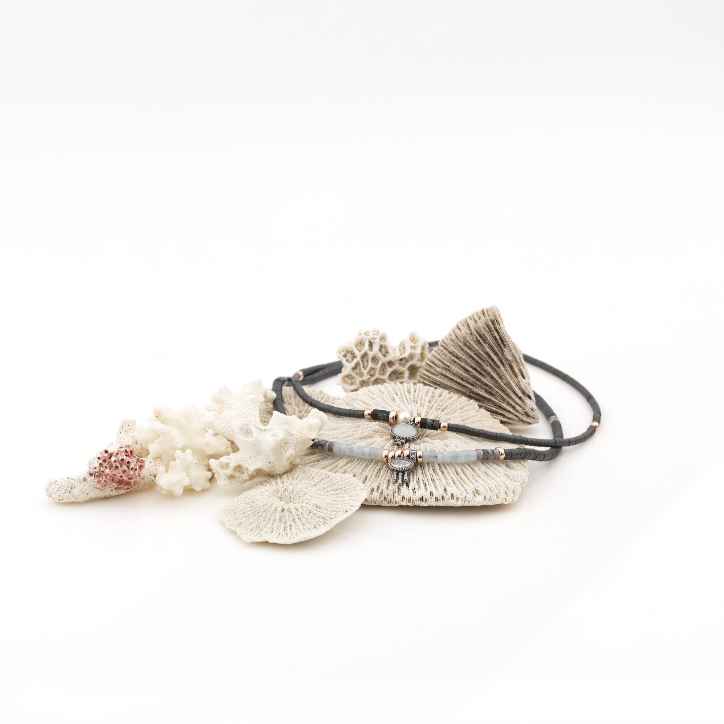 Bracelet en argent sterling, perle baroque, jaspe gris, zircons et nylon.