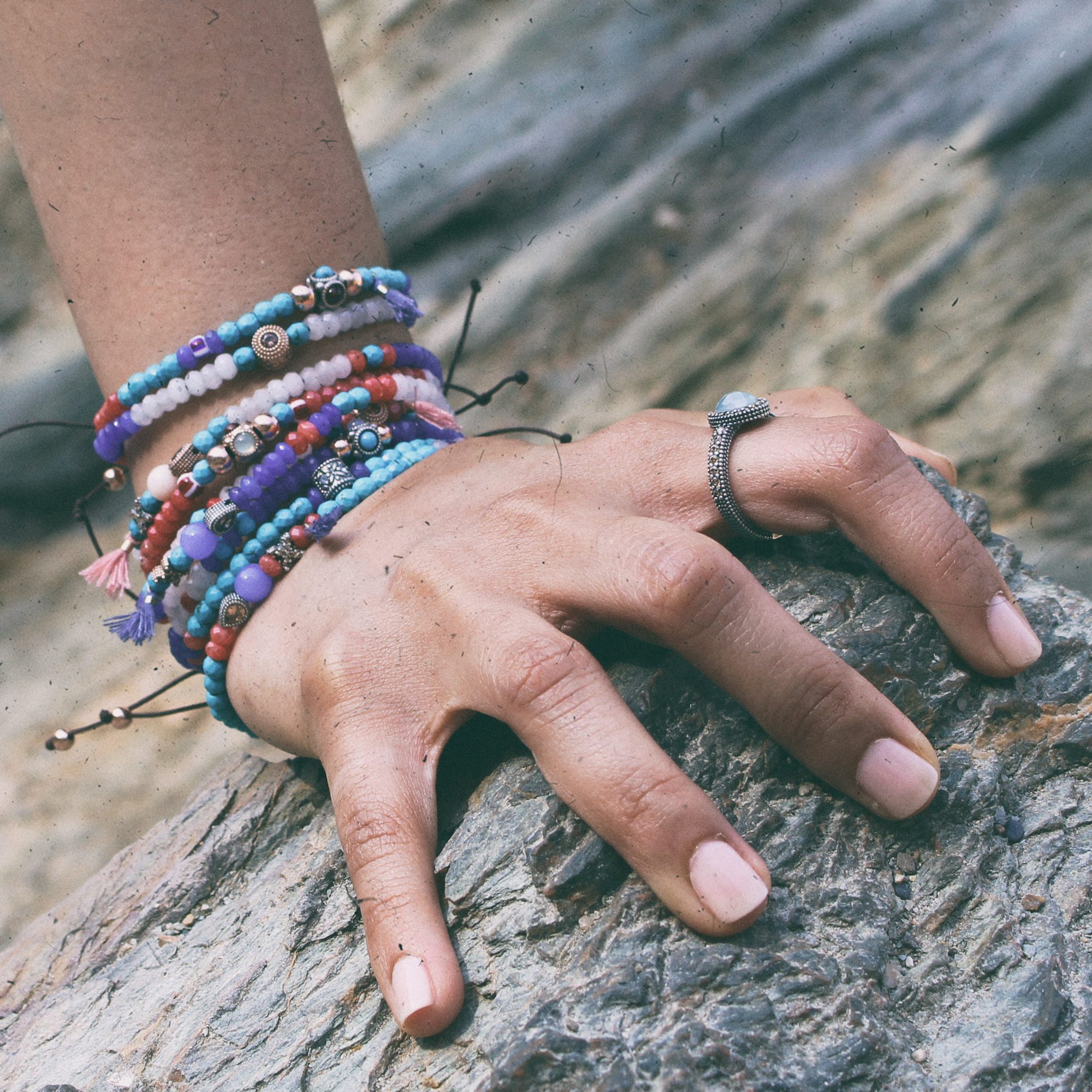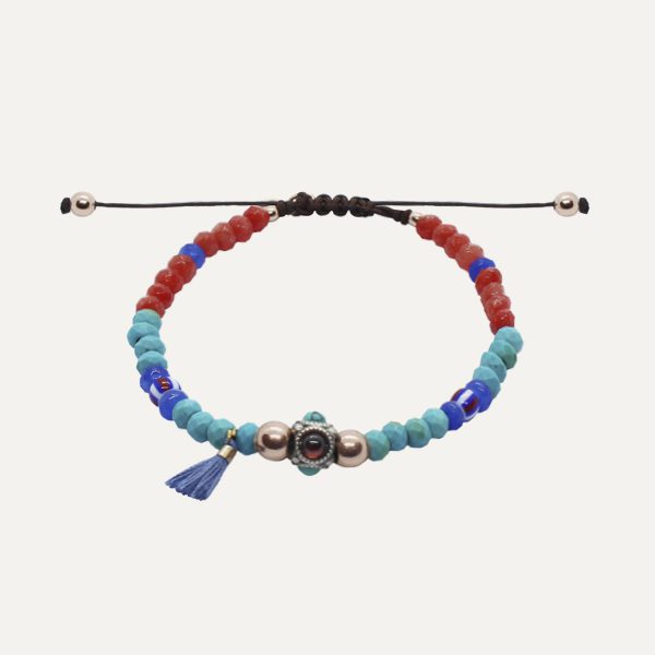 Bracelet en argent, turquoise, grenats, zircons, perles de verre et nylon.