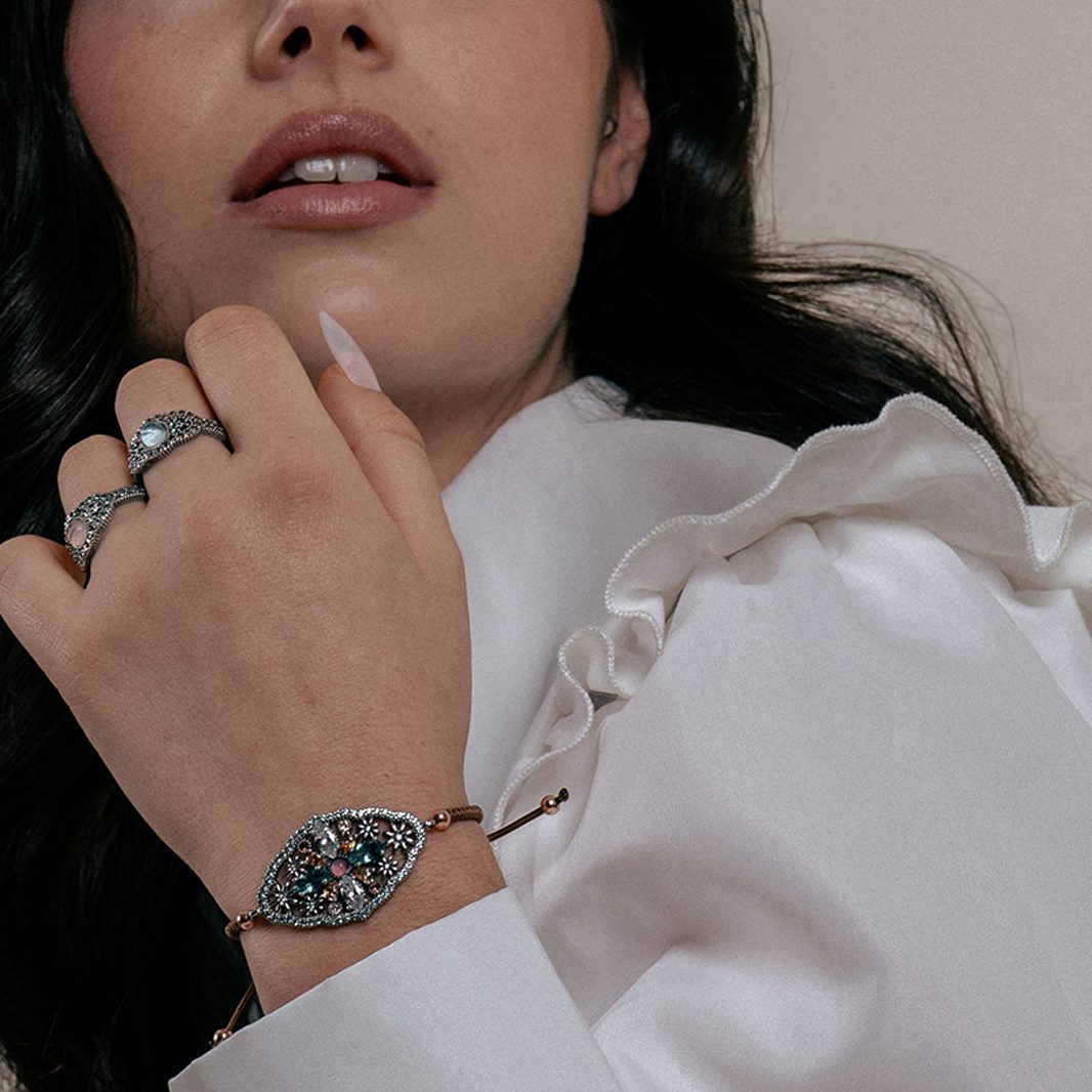 Bracelet en argent 925, avec pierre centrale et zircons. Disponible en plusieurs couleurs.