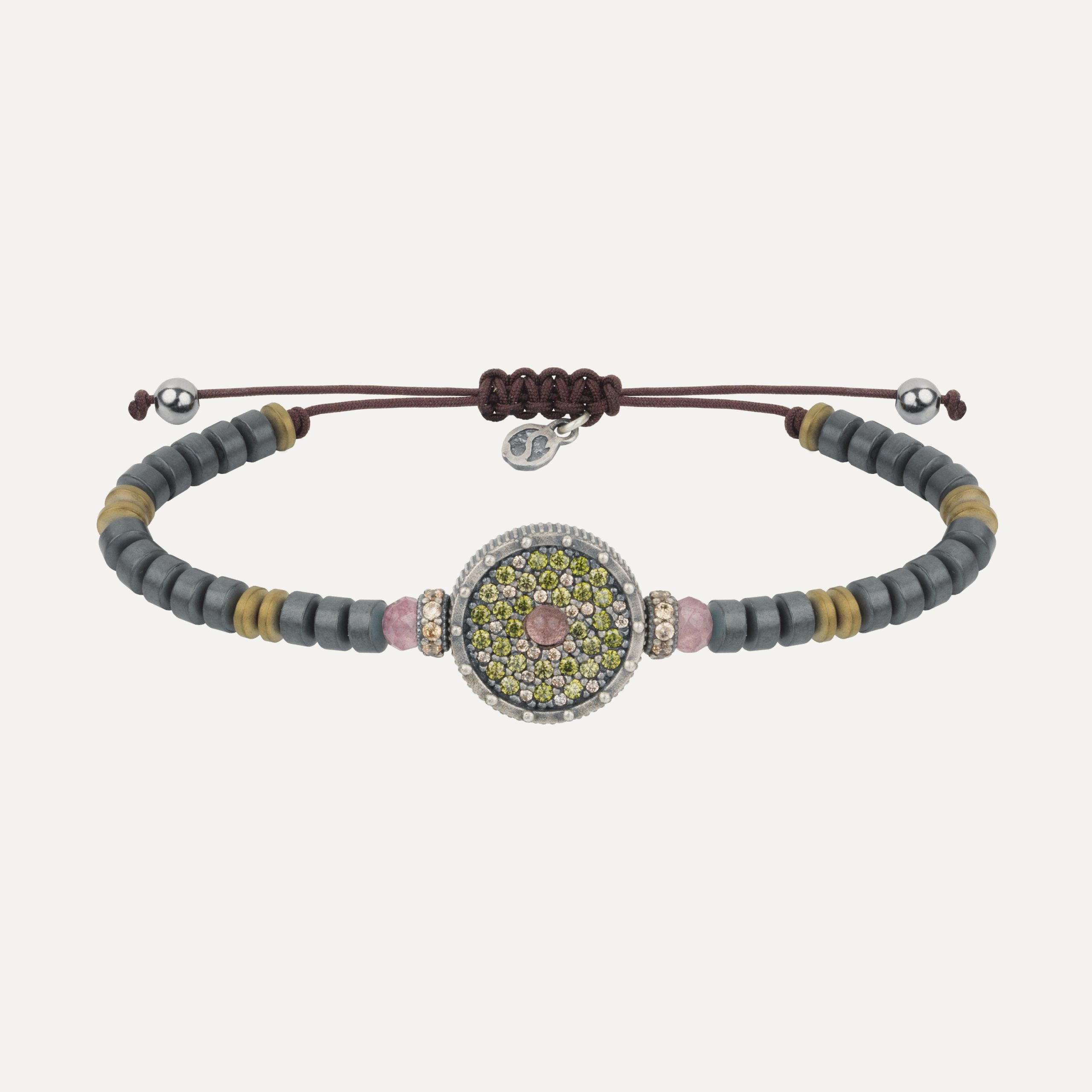 Bracelet en argent 925 avec tourmaline rose, zircone, perles de verre, hématite et nylon.