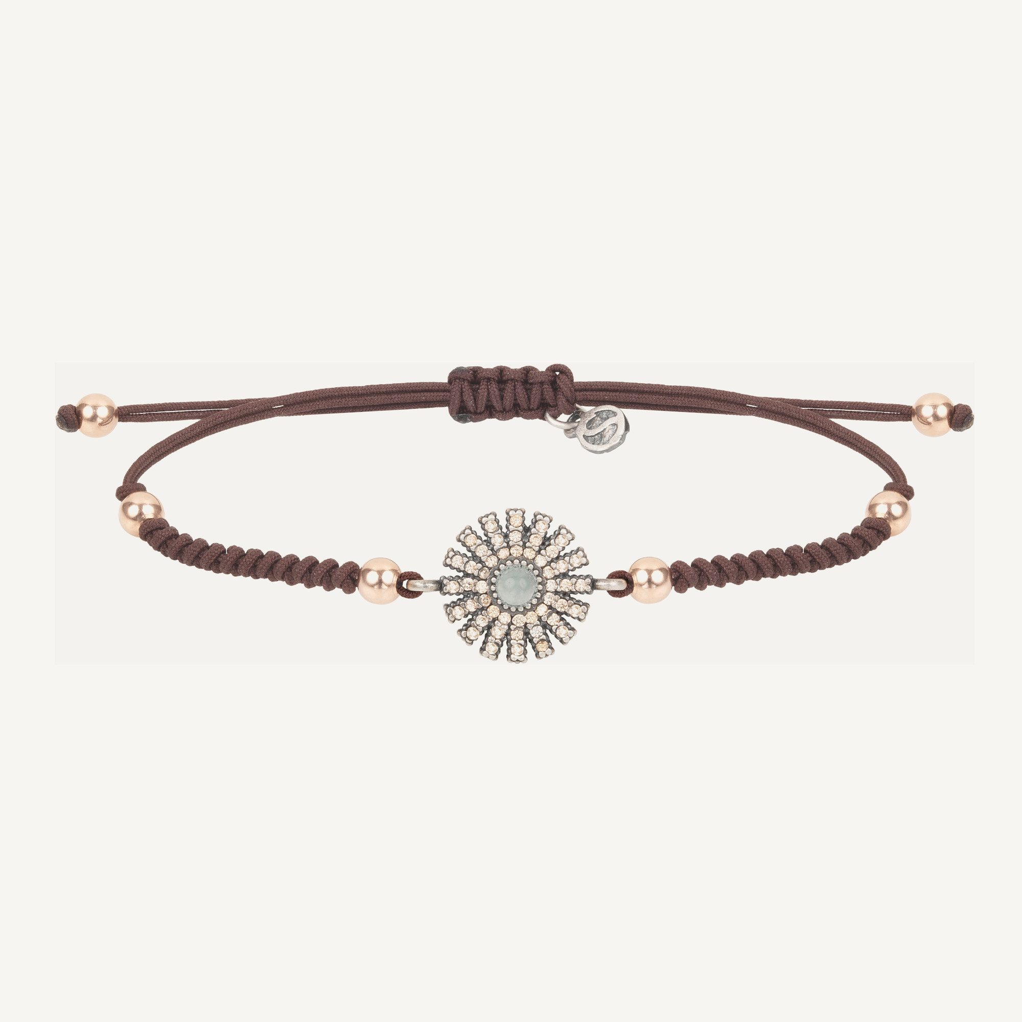 Bracelet en argent 925 avec placage en or rose 24kt, zircons, perles de verre et nylon.