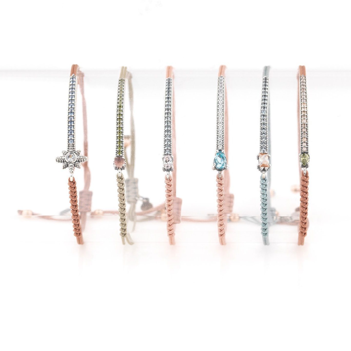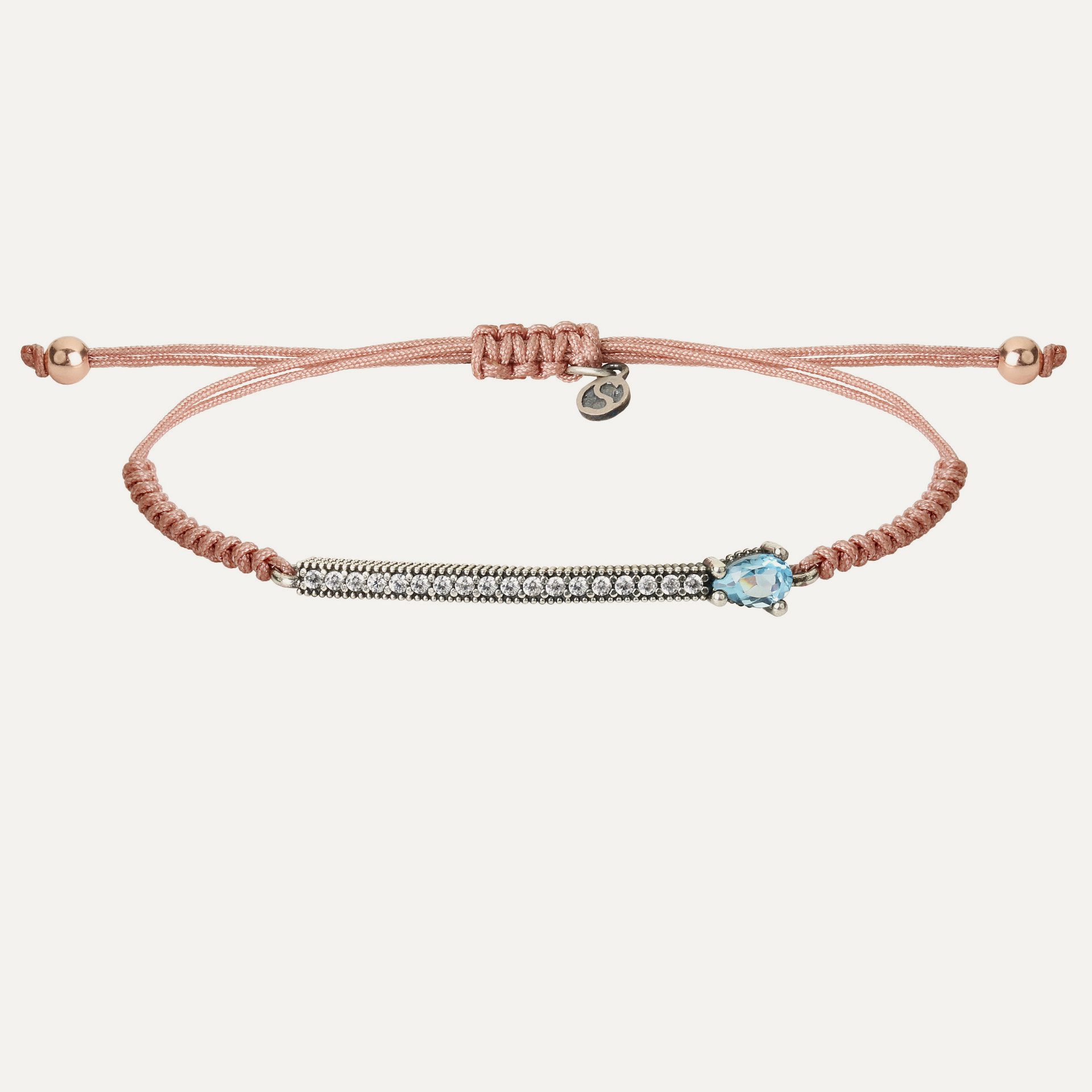 Bracelet en argent 925, quartz aigue-marine, zircons et nylon.