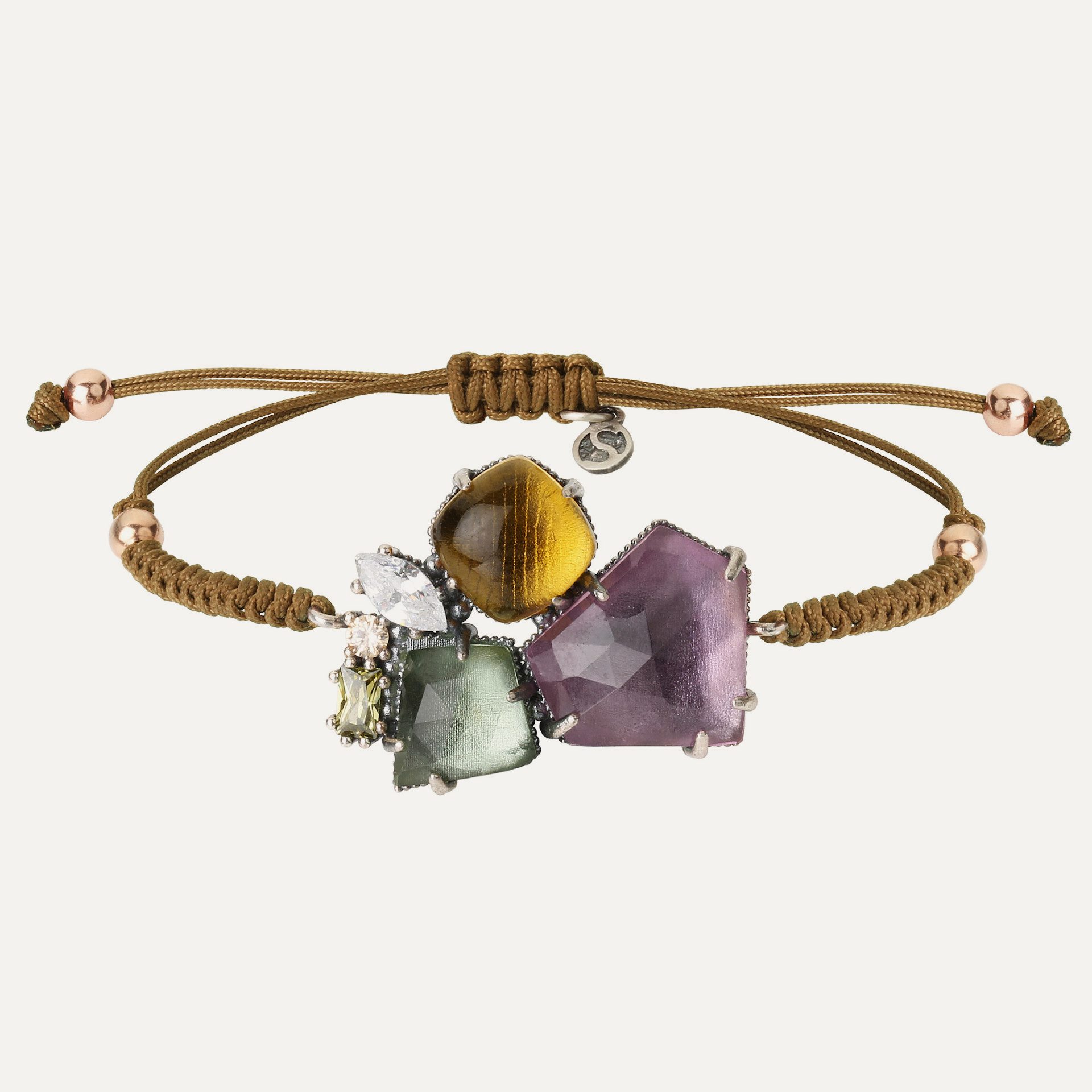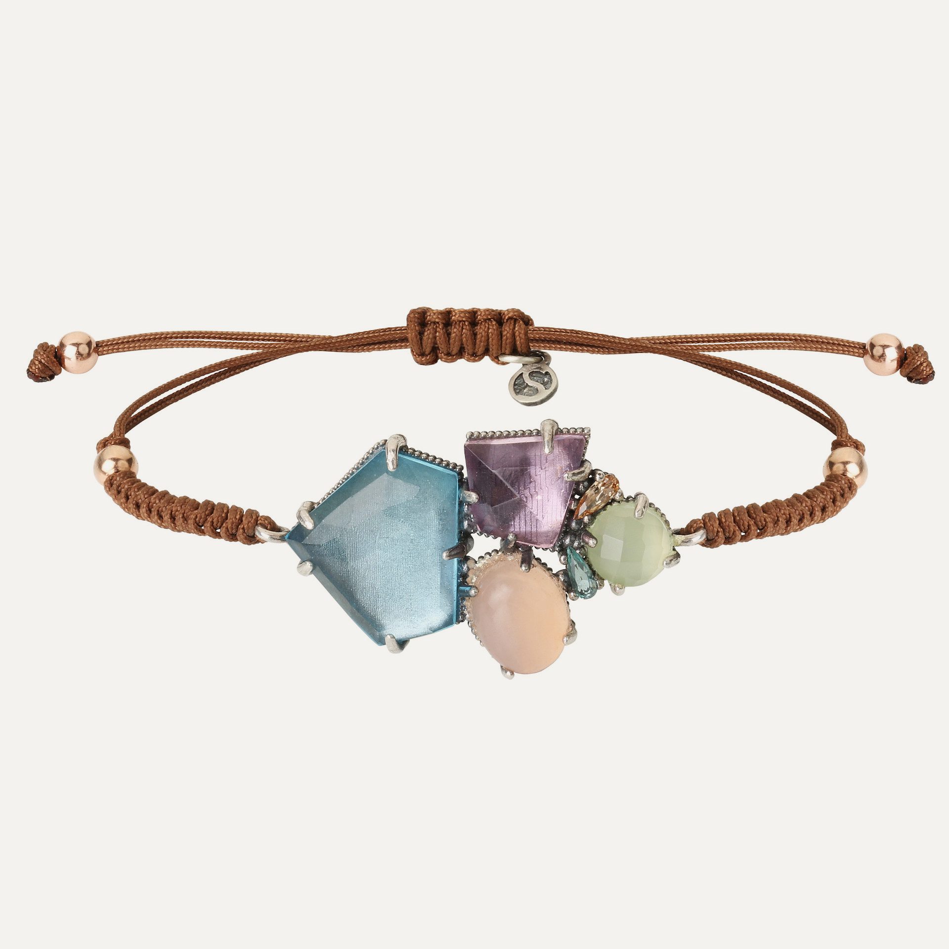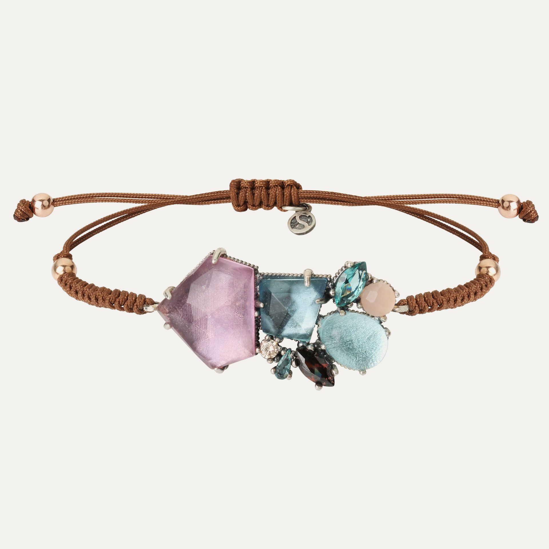 Bracelet en argent 925, quartz de couleur (rose, violet et aigue-marine), zircons et nylon.