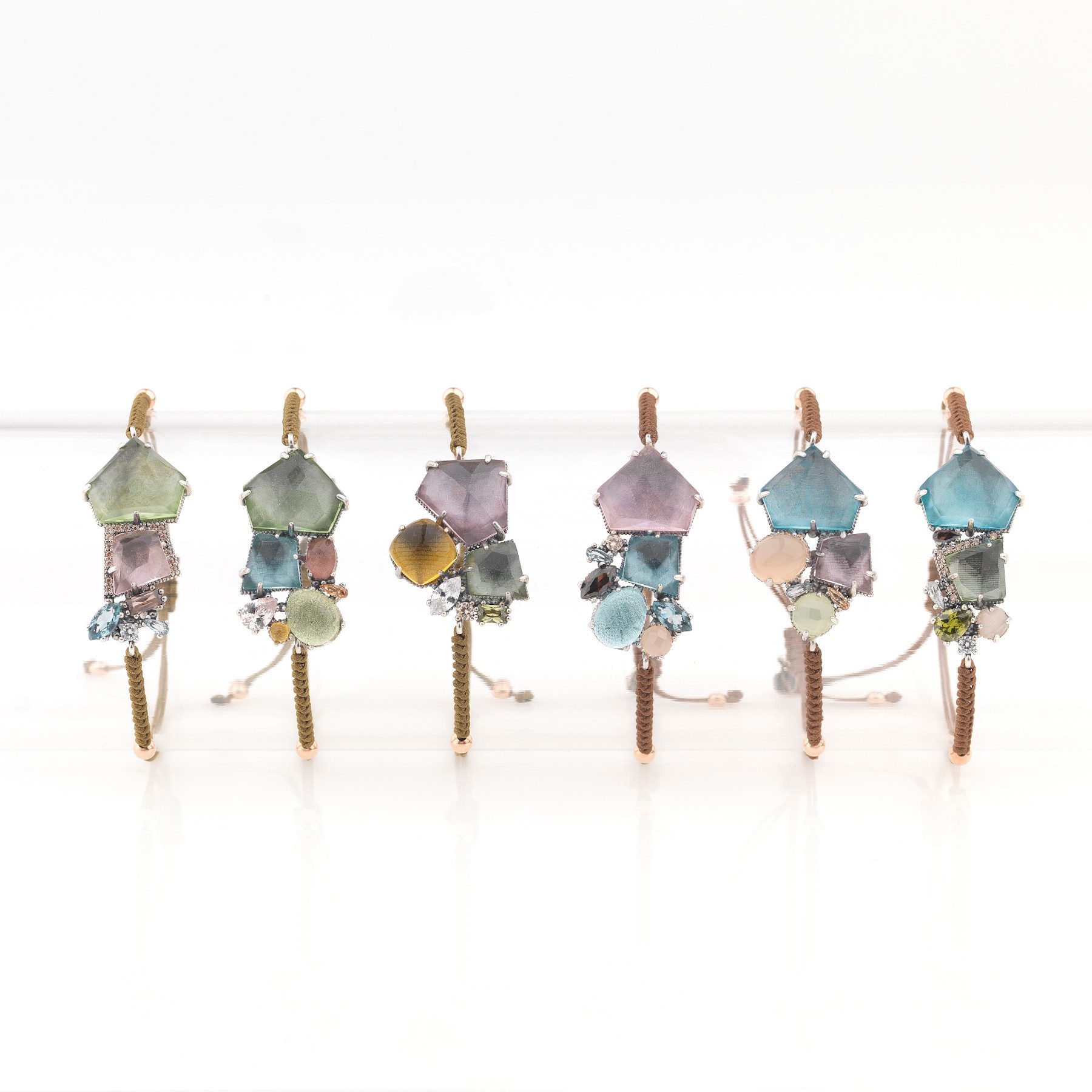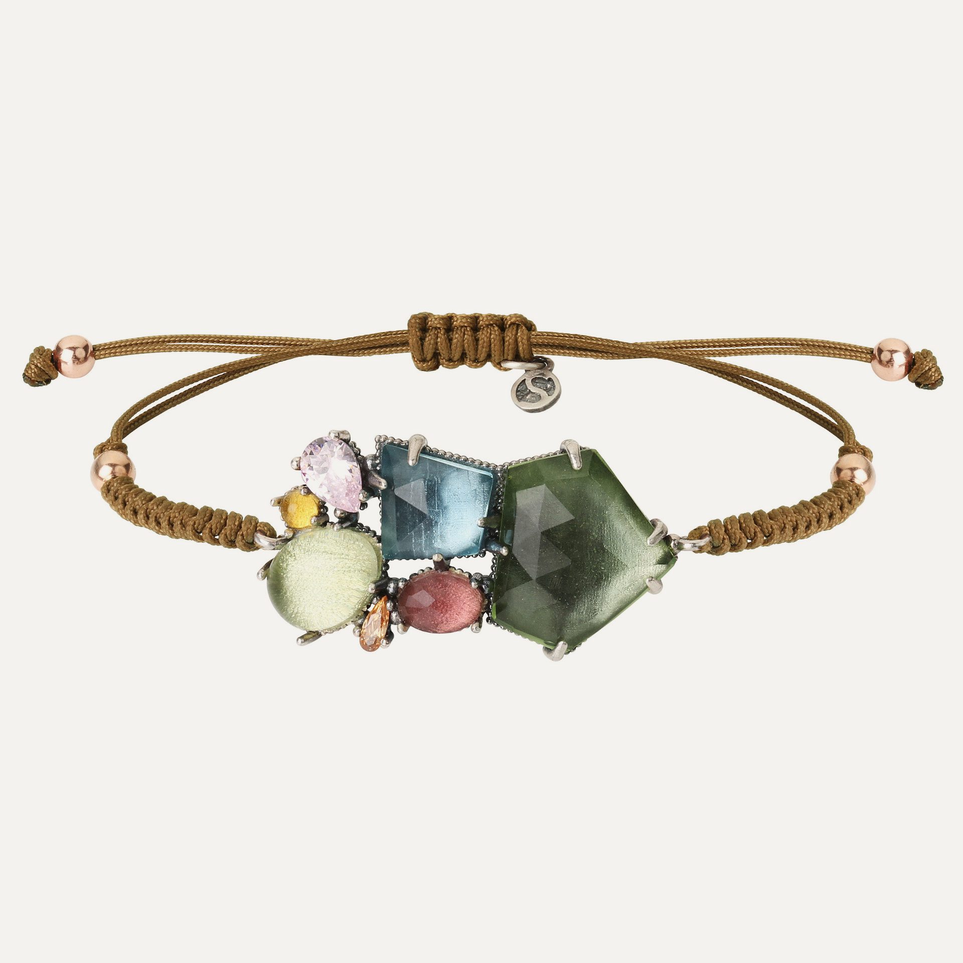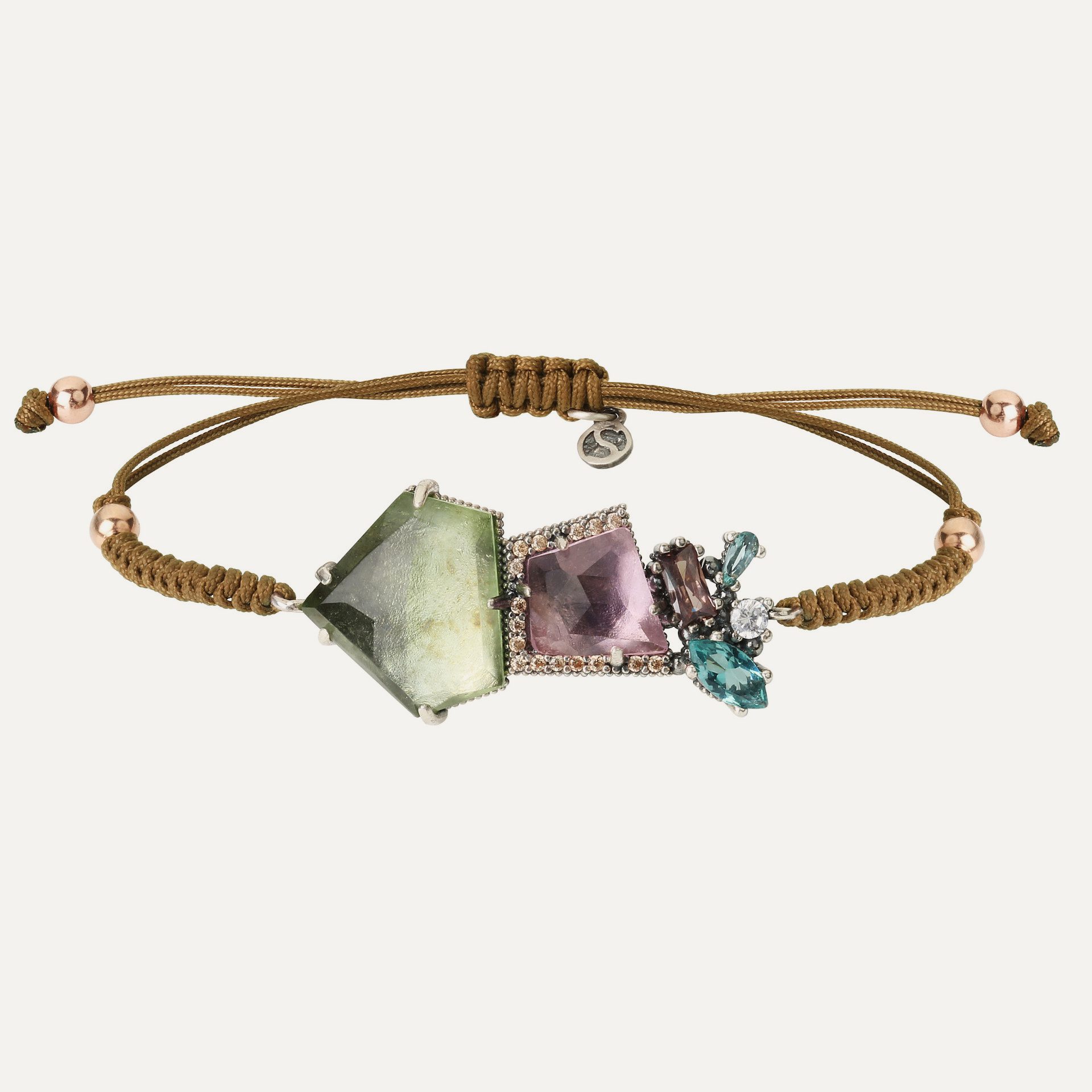 Bracelet en argent 925, quartz rose, quartz coloré facetté de taille irrégulière, zircons et nylon.