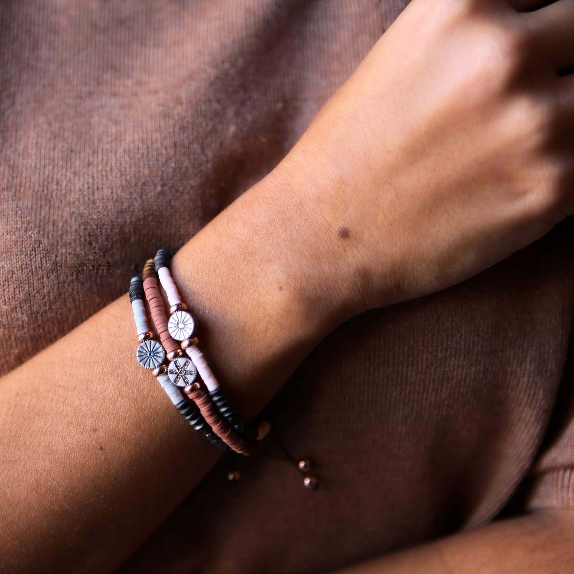 Pulsera de plata de ley 925 con oro de 9 kt, cuentas de cristal, hematites, caucho y nylon.