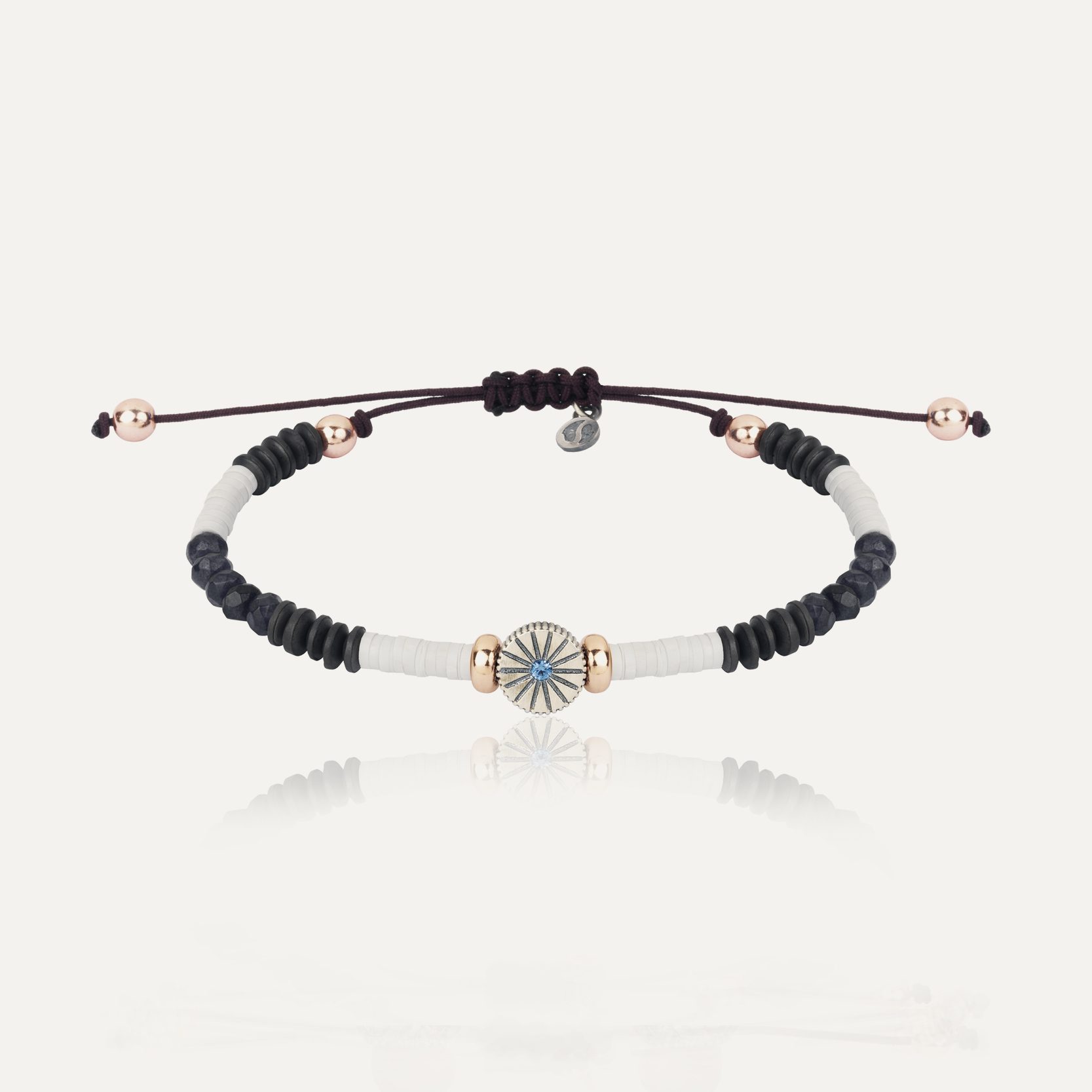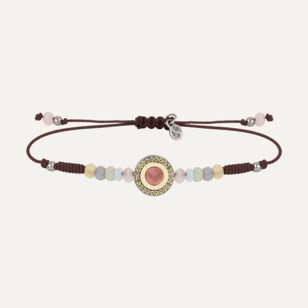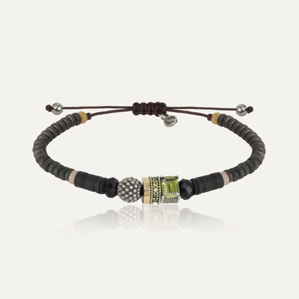 Pulsera de plata de ley 925 con acabado envejecido, calcedonia, cuarzo fumé, circonitas y nylon.