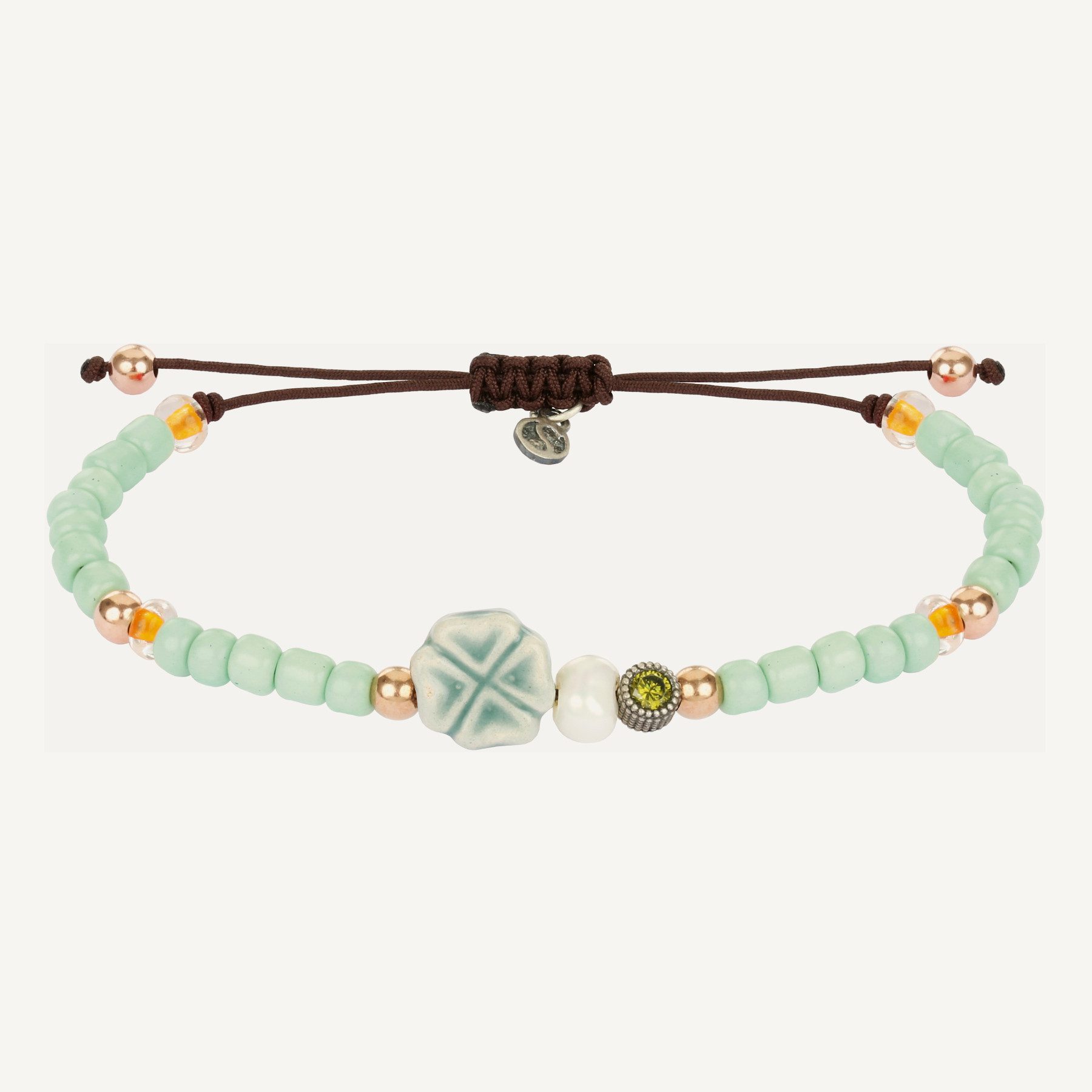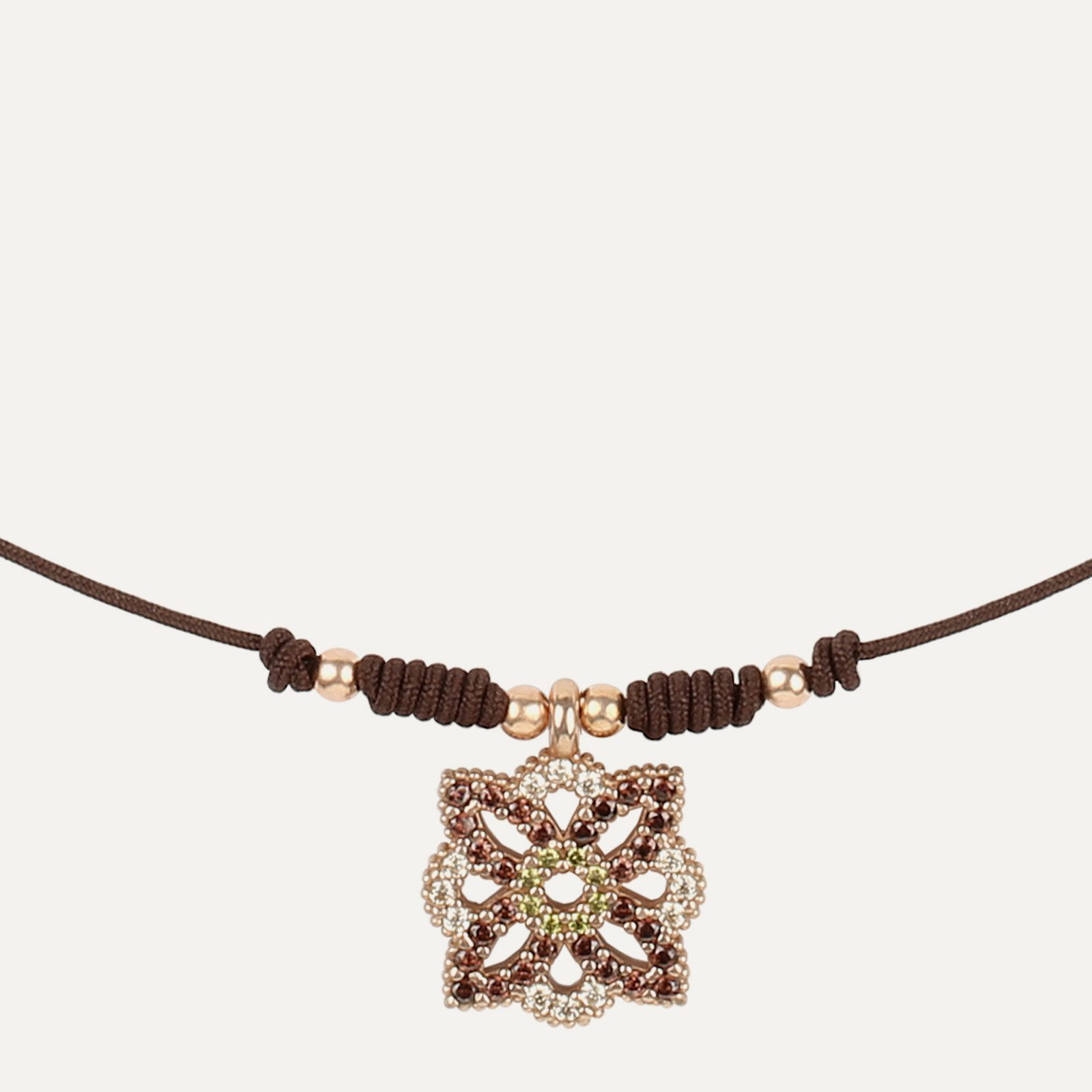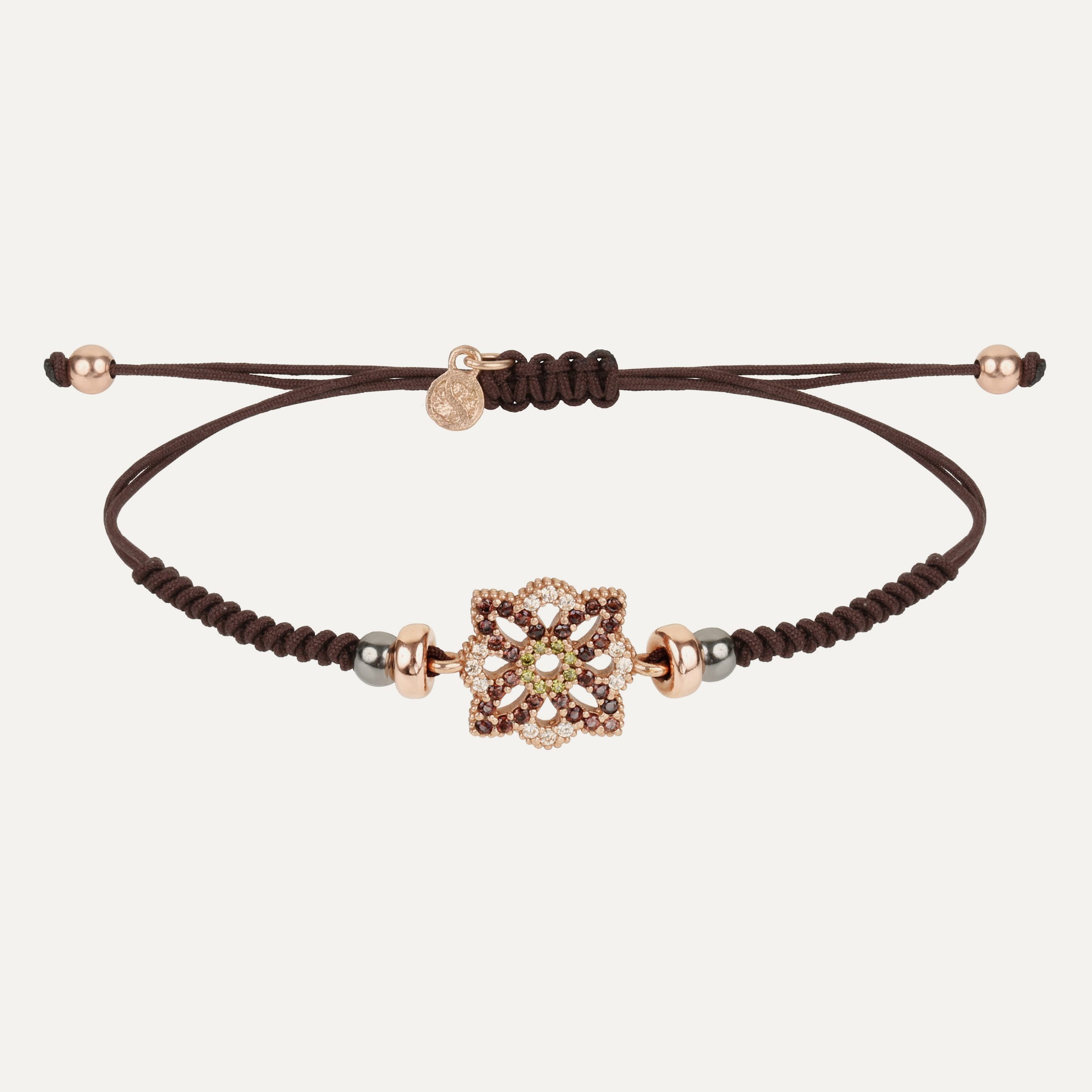 Bague en argent 925 plaqué or rose 24kt. Elle est couronnée au centre par un cabochon de calcédoine lisse de 10 mm de diamètre accompagné de quatre cabochons coussins de quartz rose lisse de 4×4 mm.
