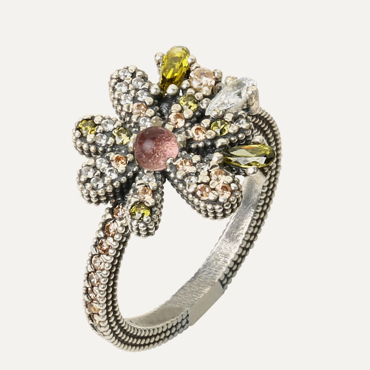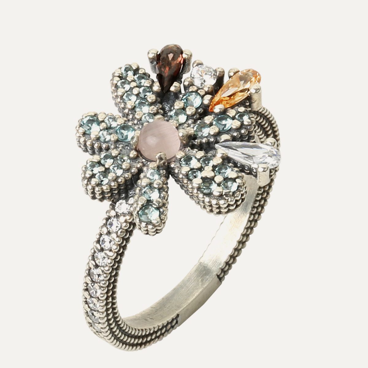 Une paire de boucles d’oreilles qui grimpent le long de l’oreille en forme de marguerite grimpante, ces boucles d’oreilles spéciales sont une pièce de joaillerie unique. Mesurant 2,5 cm de long et 1,5 cm de large, elles sont fabriquées en argent sterling avec une finition antique, des zircons de taille différente sertis à la main et un cabochon central lisse de 3 mm qui attire l’attention.