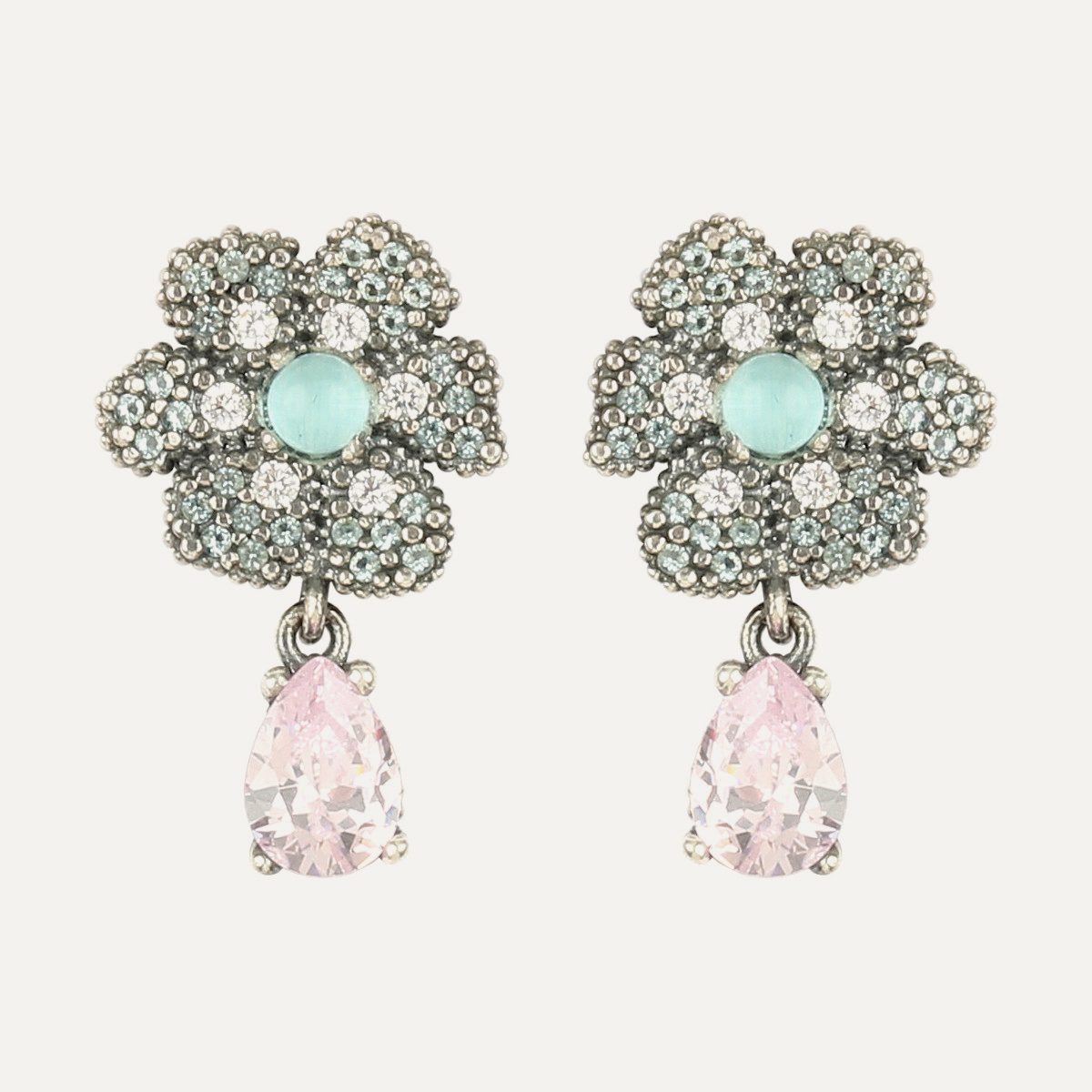 Boucles d’oreilles en argent 925 avec quartz rose et zircon, dans un choix de deux combinaisons de couleurs.