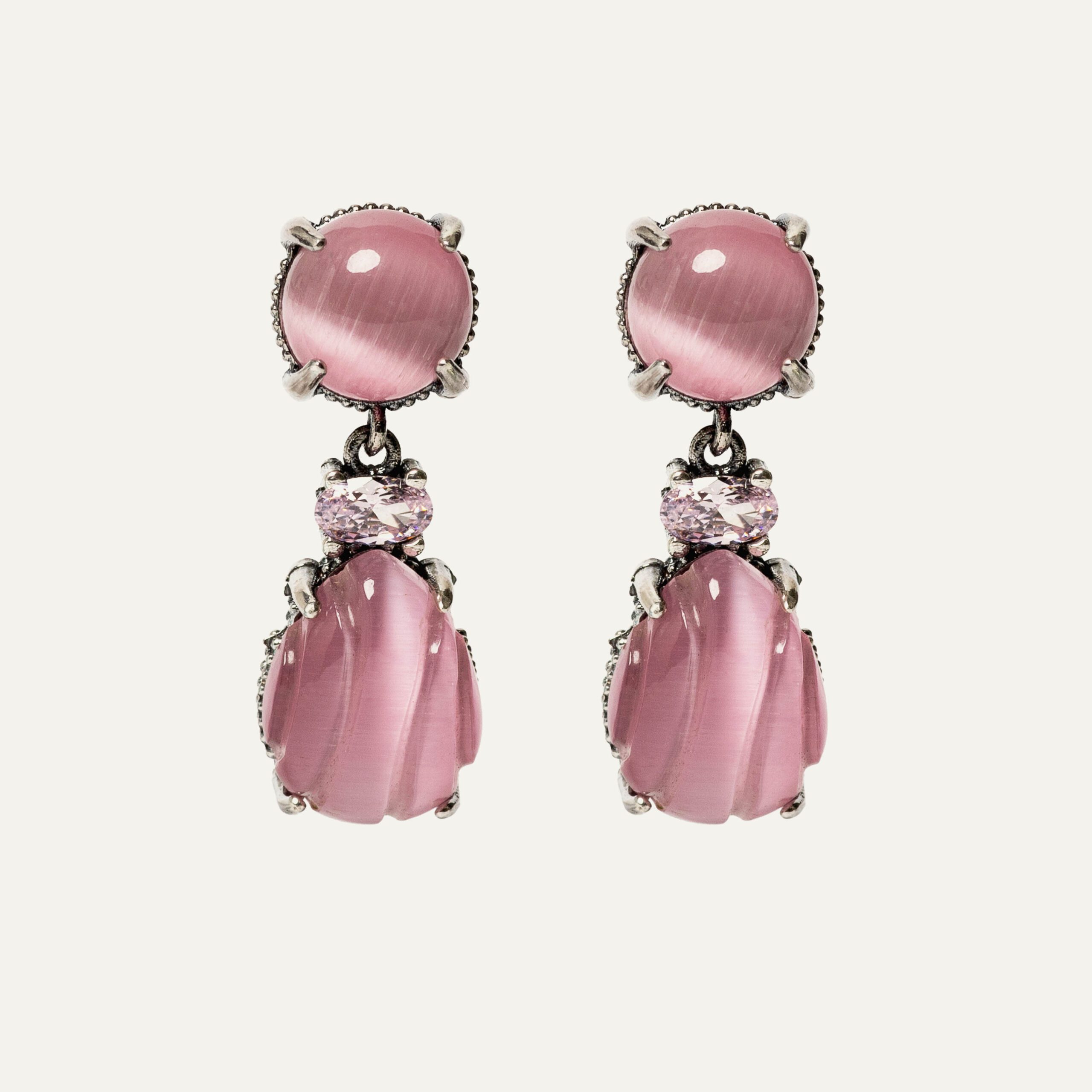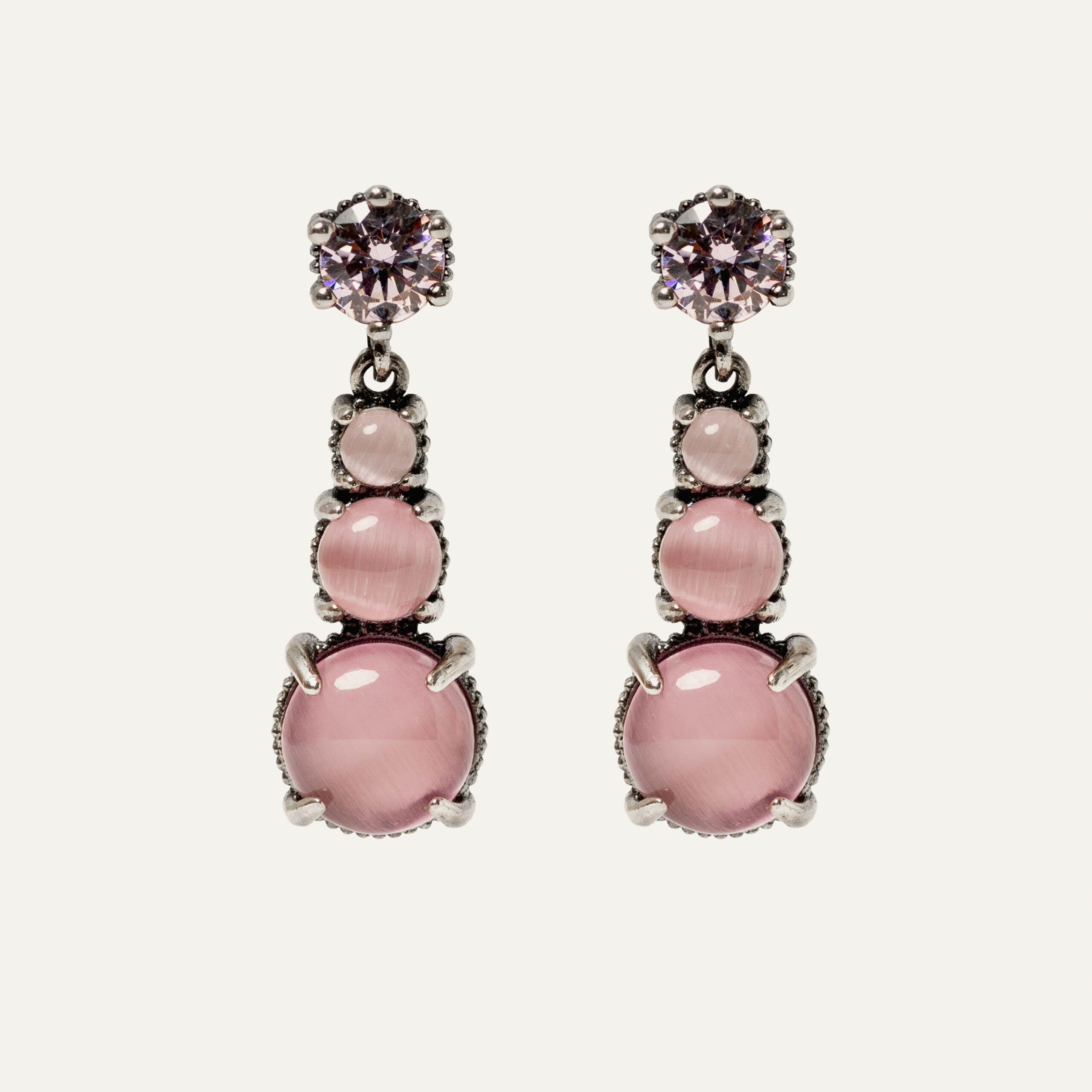 Sur la partie fixe se trouve une perle arrondie d’environ 0,8 cm de diamètre, accompagnée de trois zircons en forme de goutte, sertis à la main en argent 925 sterling avec une finition antique : sur les côtés en couleur cava, et le central en couleur vert péridot.