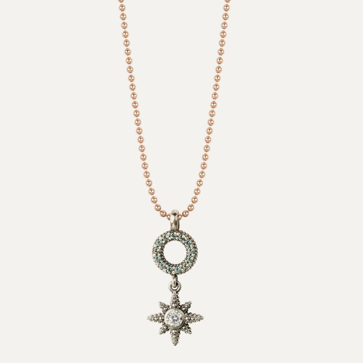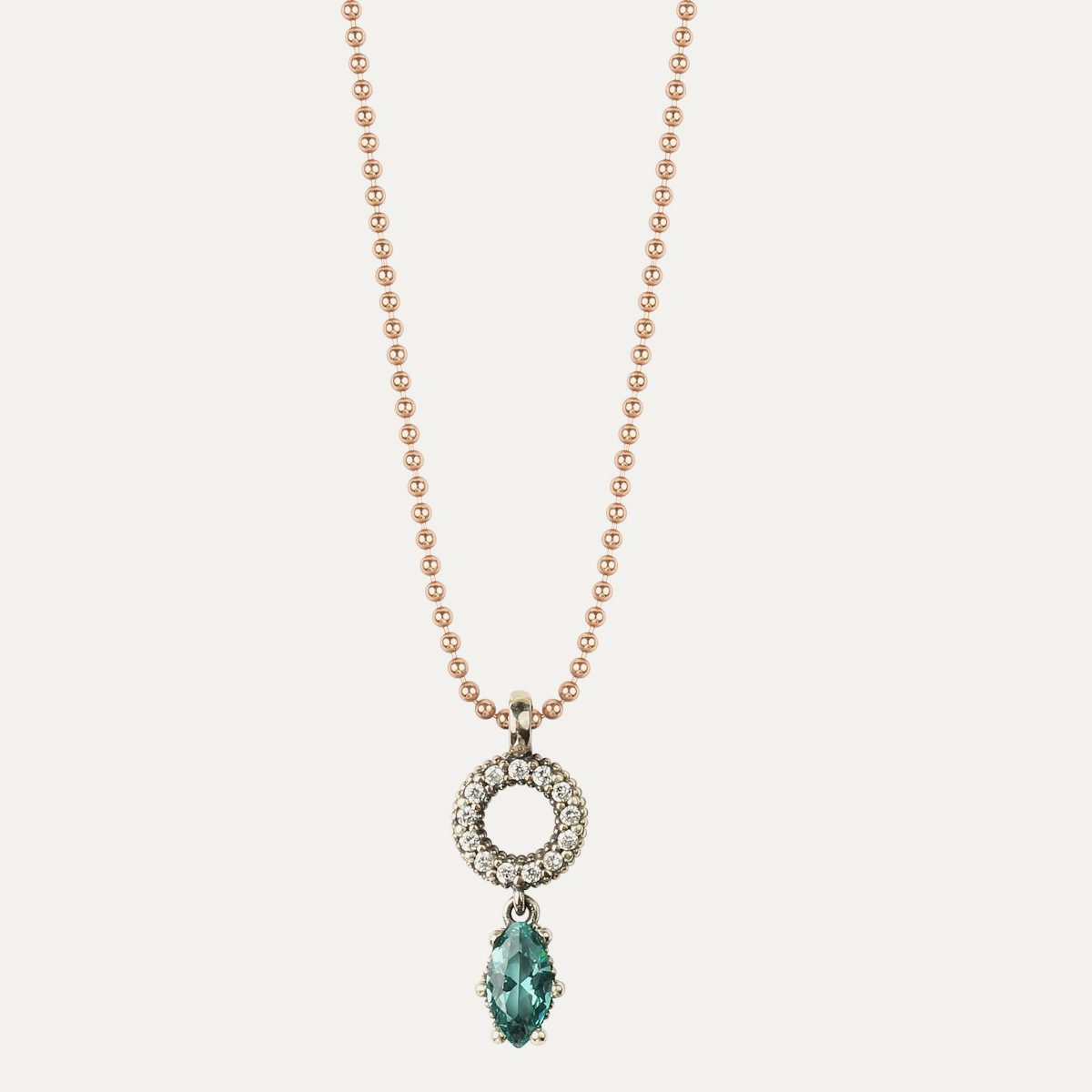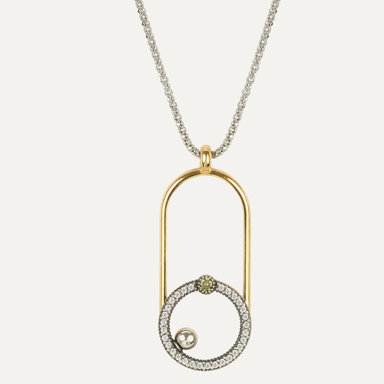 La partie supérieure est constituée d’une zircone cubique de 5×3 mm de taille baguette, surmontée de deux zircones cubiques de couleur cava. Un cercle en argent vieilli avec des zircons sertis à la main, d’un diamètre de 1 cm, est suspendu à un anneau en argent. La hauteur totale de ce bijou intemporel est de 2 cm et sa largeur de 1 cm.