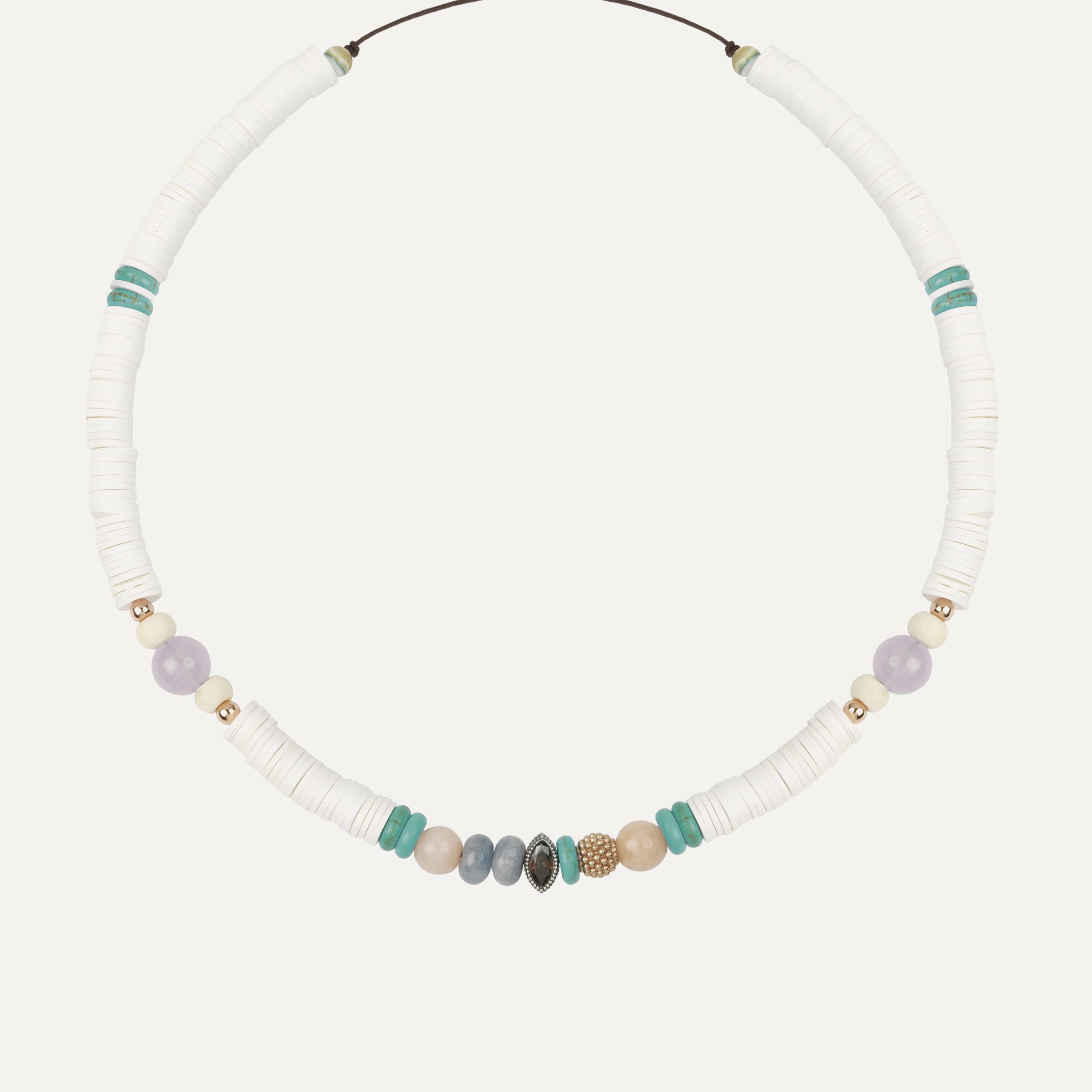 Bracelet en argent 925 avec de l’or 9 kt, des perles de verre, de l’hématite, du caoutchouc et du nylon.