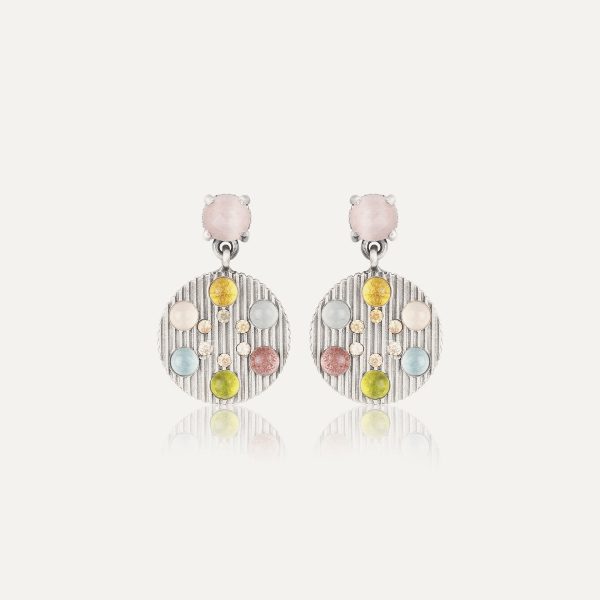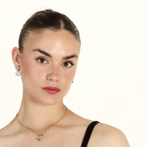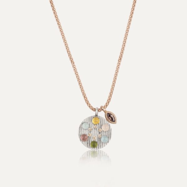 Ces bracelets sont la touche finale de la mini-collection Pavlova de Sunfield, puisqu’il existe également des pendentifs et des boucles d’oreilles assortis. La pièce maîtresse est une médaille en argent sterling 925 de 15 mm de diamètre à la finition antiquée, ornée de zircons champagne de taille brillante et de six cabochons de 3 mm de diamètre en citrine, quartz rose, opale simili, péridot, tourmaline rose et calcédoine. Le reste du bracelet est composé d’un fil de nylon brun qui combine un magnifique macramé et des pièces en argent plaqué or rose 18 carats. Il est également réglable en taille.