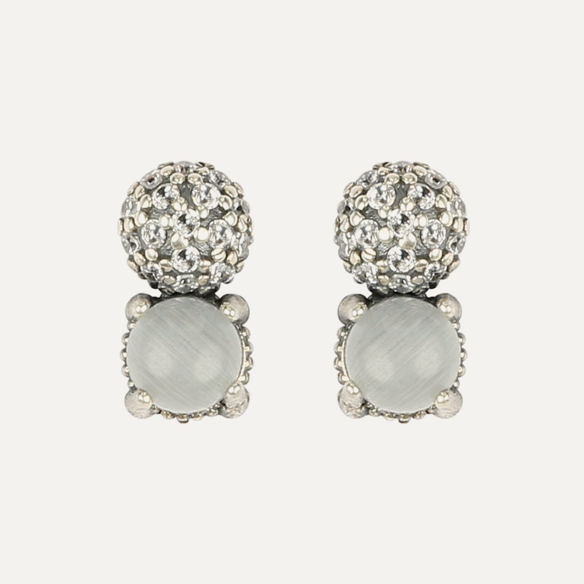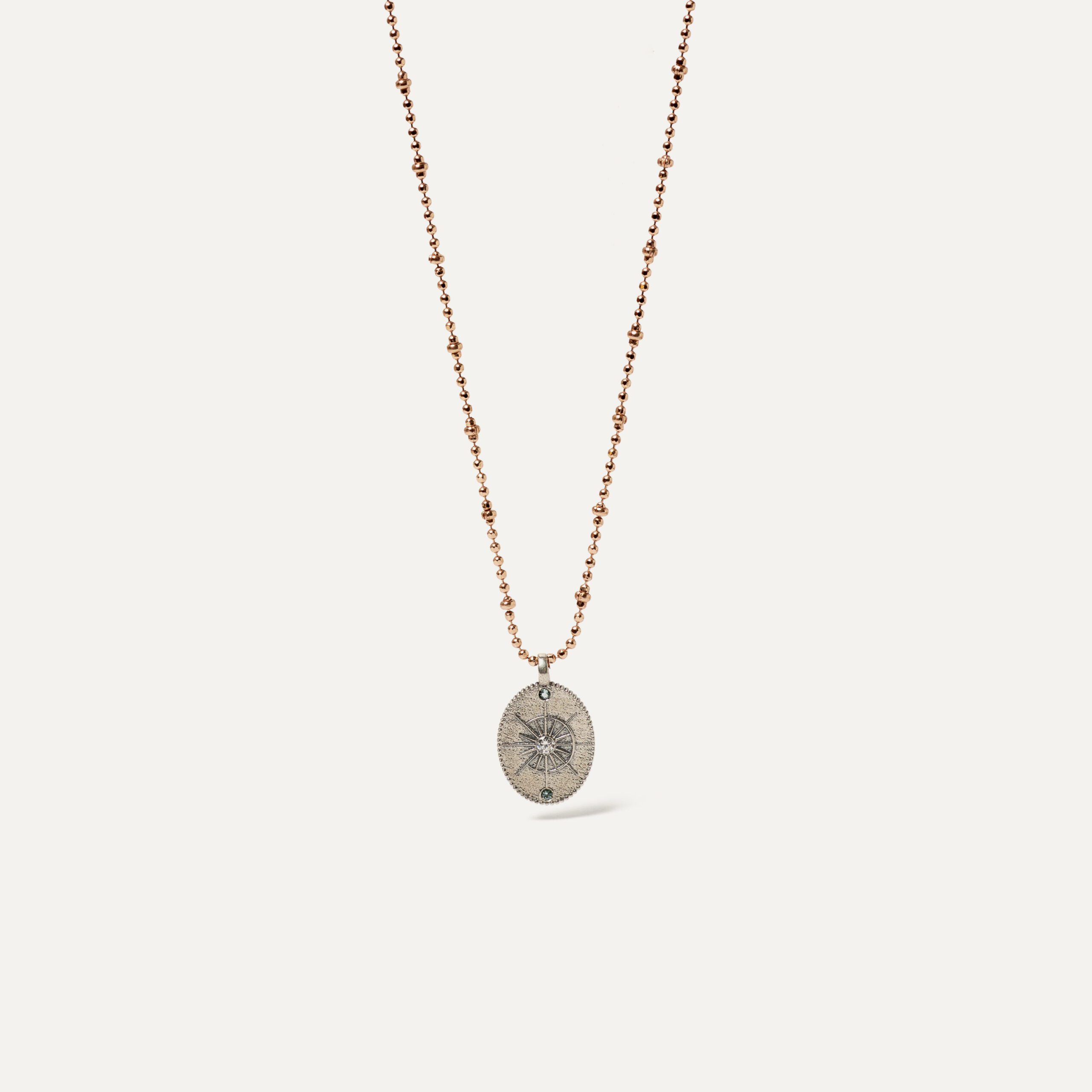 Bracelet en argent en forme de médaille classique, de 1 cm de long par 0,5 cm de large. Au centre, un motif de lune sur argent antique fini à la main, avec un zircon blanc de 2 mm et deux zircons vert menthe de 1,25 mm taillés en brillant.