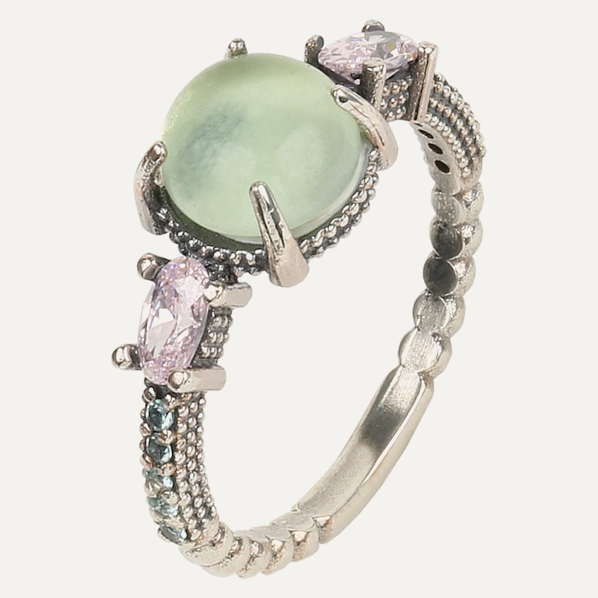 Le design est complété d’un côté par un trèfle de zircon cubique taillé en marquise, deux en vert et un central en vin. De l’autre côté, un cabochon de quartz rose lisse entouré de zircon cubique blanc taillé en brillant apporte une touche romantique.