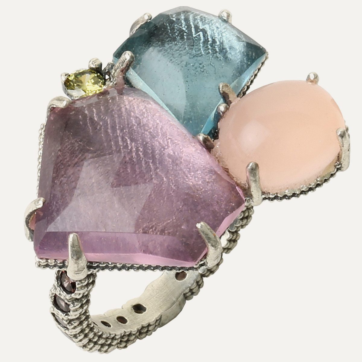 Ce bracelet en argent sterling associe un cabochon de citrine taillé en couronne à des quartz de différentes couleurs et à des zircons plus petits, dans une combinaison inspirée par la nature. Le fermoir est constitué d’un nœud macramé réglable en nylon et les interlinks qui ornent le fil sont en argent sterling plaqué or rose 24kt.