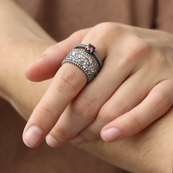 Bracelet en argent 925 avec quartz rose, agate, perles de verre, zircon et nylon. Au centre, un cabochon de 3 mm de quartz rose lisse monté sur argent sterling avec une finition antique, accompagné d’un cabochon de zirconium turquoise taillé en brillant avec la finition graffito caractéristique de la signature des bijoux Sunfield.