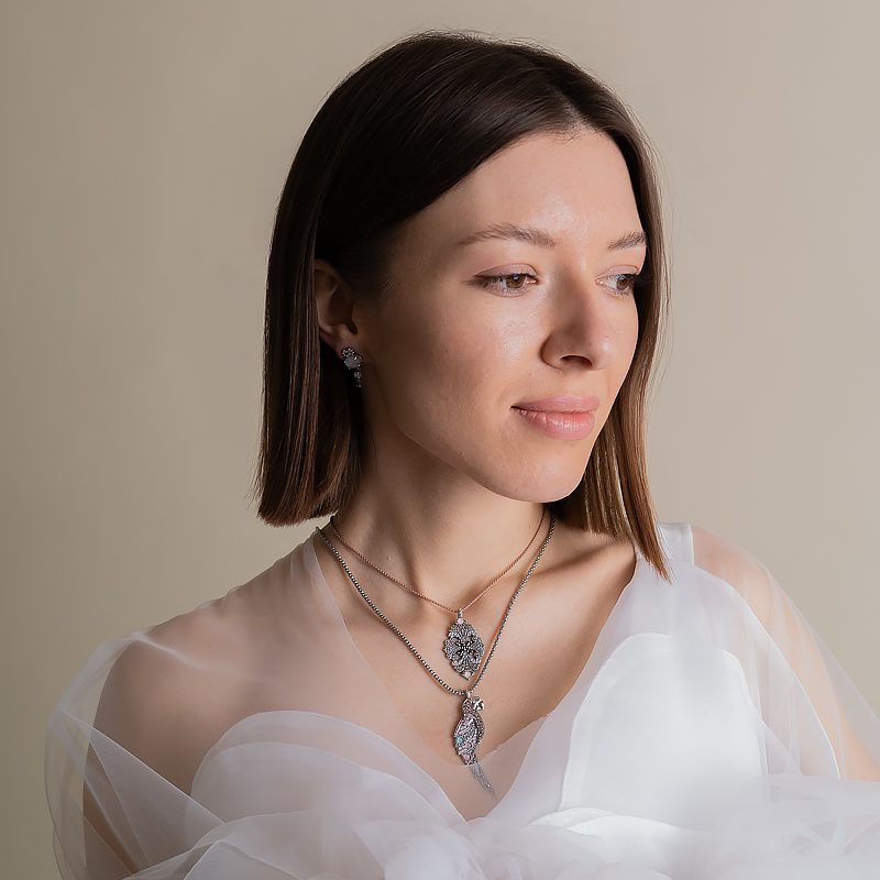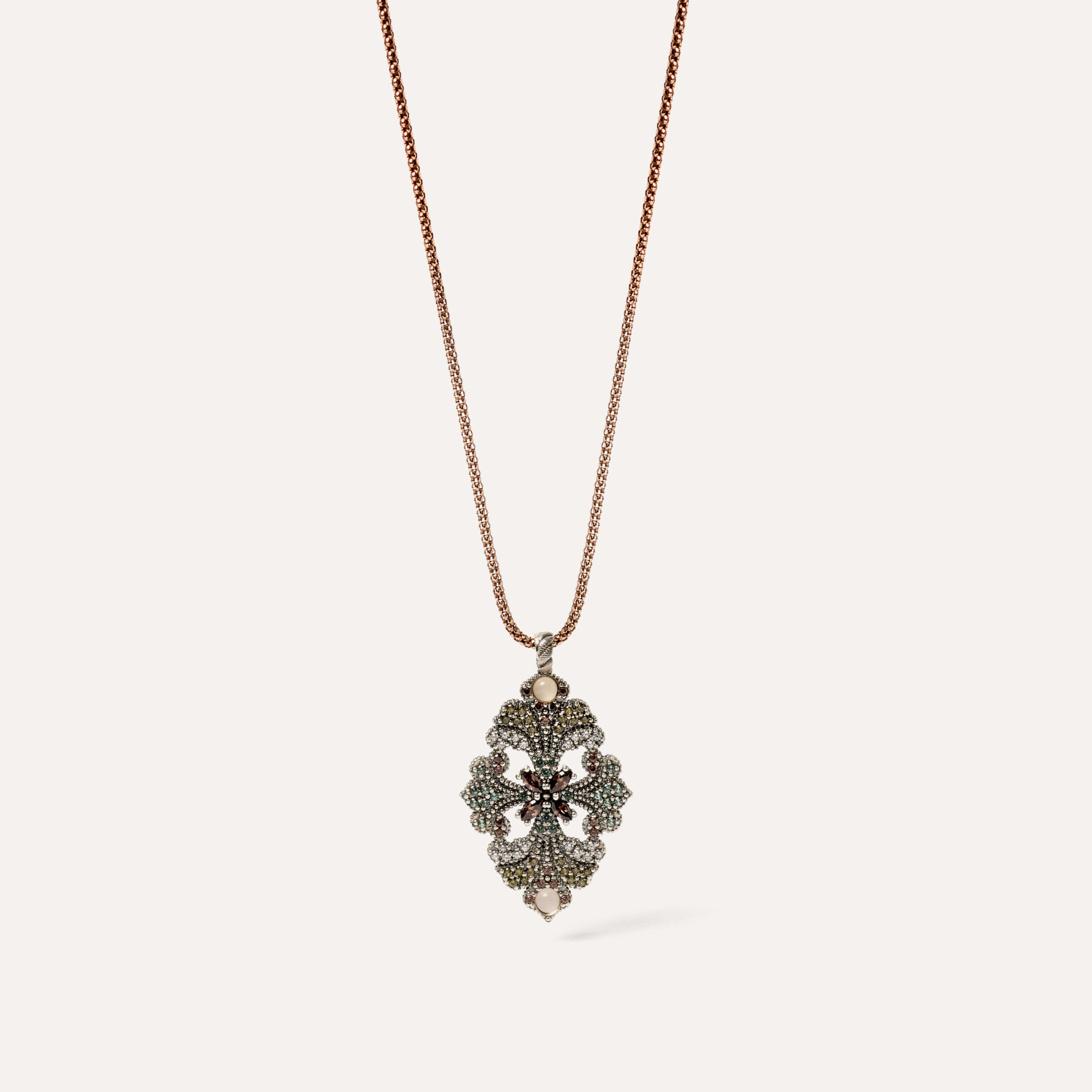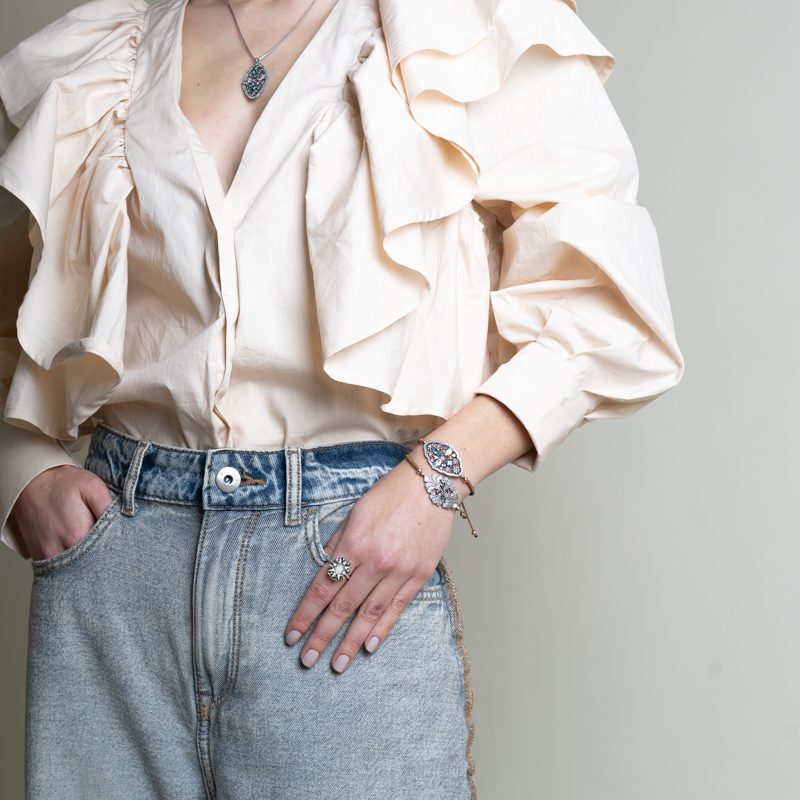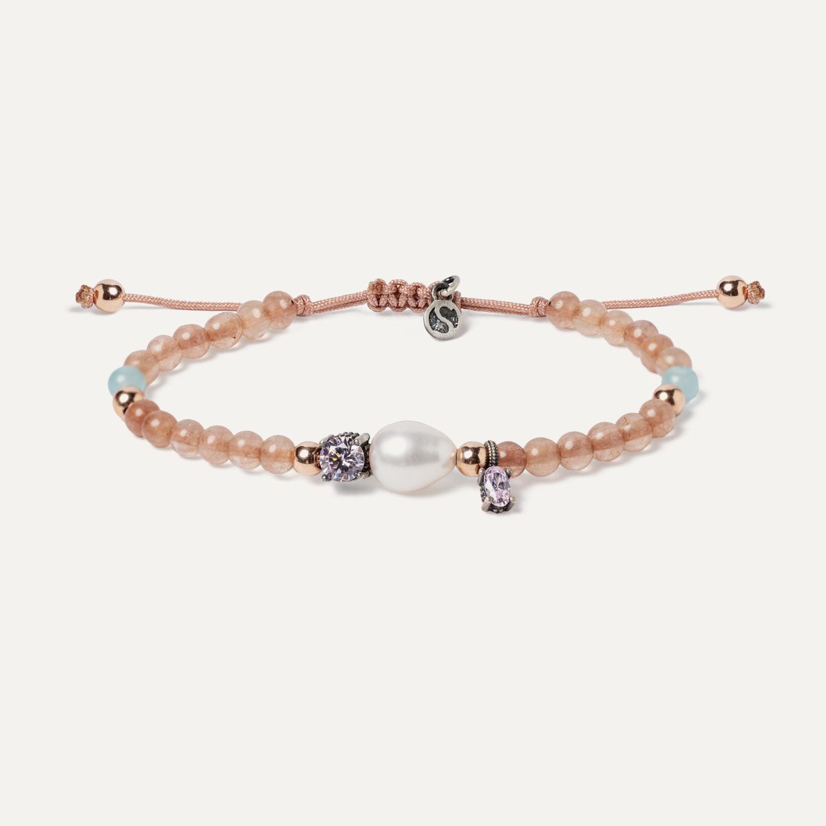 Les perles qui complètent l’ensemble sont en argent sterling plaqué d’or rose 24kt et se ferment à l’aide d’un fermoir macramé réglable pour plus de confort.