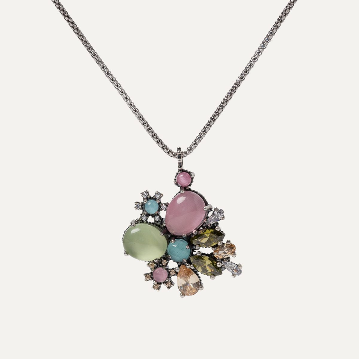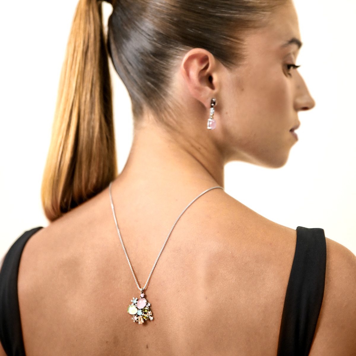 Dans ce cas, un grand cabochon facetté de forme trapézoïdale en quartz aigue-marine, une nouveauté dans la dernière collection de Sunfield, se distingue, ainsi qu’un cabochon lisse de forme ovale en quartz rose, un cabochon rond facetté en quartz pomme et un dernier cabochon de forme irrégulière en quartz rose fantaisie. L’ensemble est complété par deux zircons cubiques taillés en marquise, en cava et en turquoise.