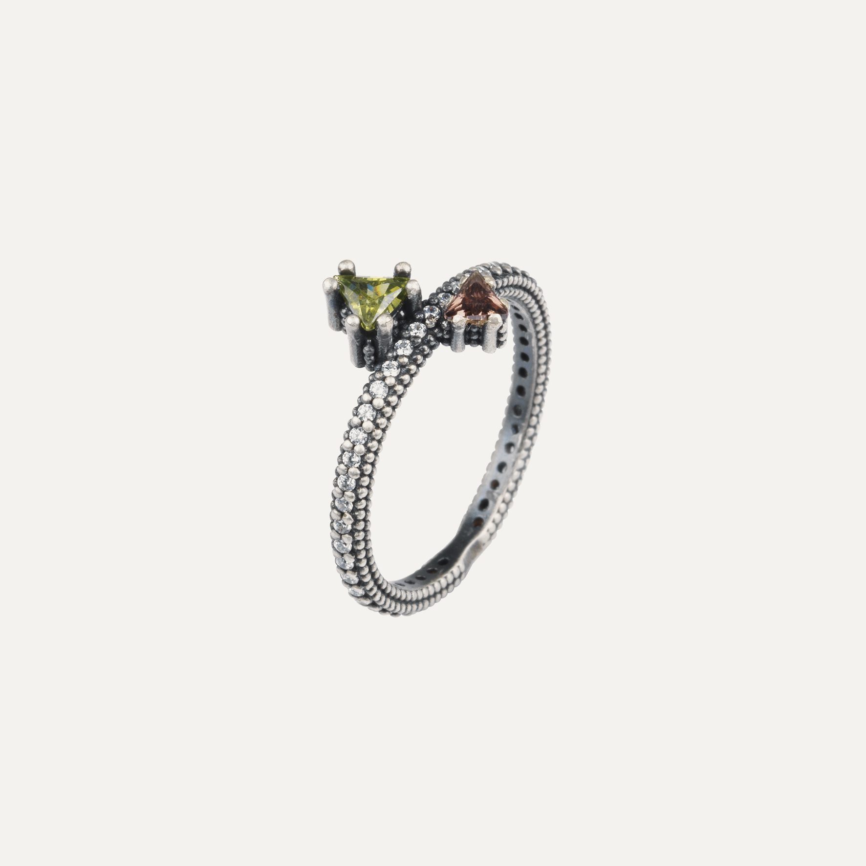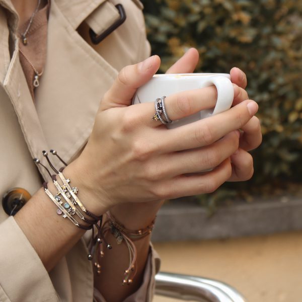 Les bracelets Simone conservent l’essence Sunfield, mais ont une touche supplémentaire de sophistication, grâce au fait qu’ils sont fabriqués en argent sterling 925 et en or jaune 9k. Le modèle comprend un cabochon de tourmaline rose lisse de 3 mm, une zircone cubique brune de taille émeraude, une zircone cubique péridot et deux zircones cubiques jaunes claires de taille brillant. Il est monté sur un solide cordon en nylon brun de longueur réglable.