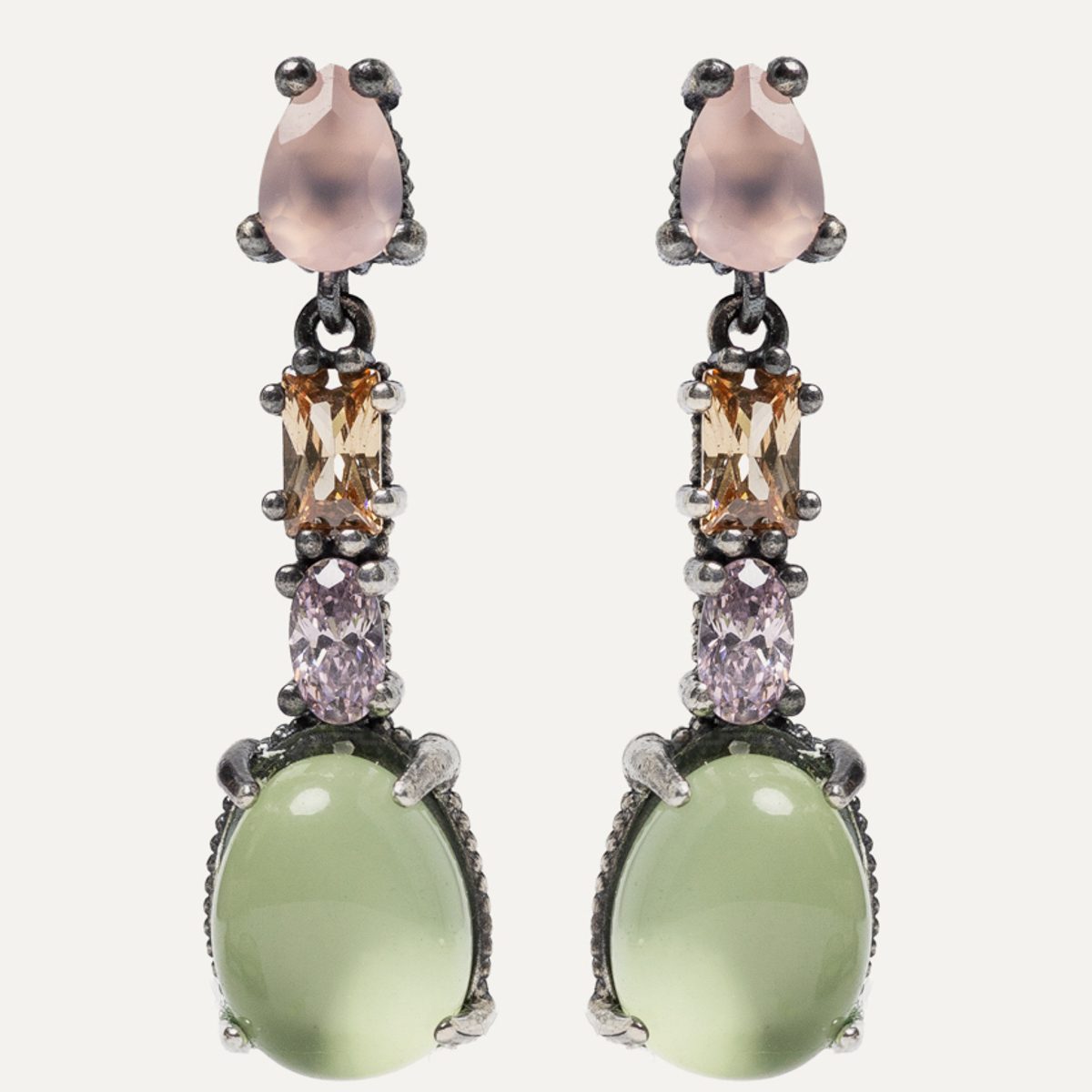 Les formes organiques inspirées de la nature sont à la mode, c’est pourquoi ce bracelet et toute la collection Bits of Nature s’inspirent des formes naturelles. Un bijou qui transmet fraîcheur et caractère, en mélangeant différentes tailles, formes et couleurs. Le cabochon facetté de forme trapézoïdale en quartz vert et le cabochon ovale lisse en quartz pomme se distinguent par leurs tons verts. Ils sont accompagnés d’un cabochon de tourmaline rose de taille ovale et d’un cabochon irrégulier de quartz aigue-marine, une nouveauté dans la dernière collection de bijoux Sunfield.