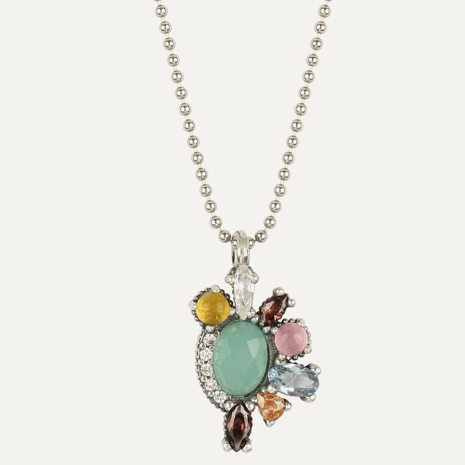 Il est complété par des zircons de différentes tailles, dans les tons bleu, cava, chocolat et blanc, et par un demi-cercle de zircons blancs taillés en brillant. La chaîne est en argent 925 avec des maillons rolo et une finition antique.