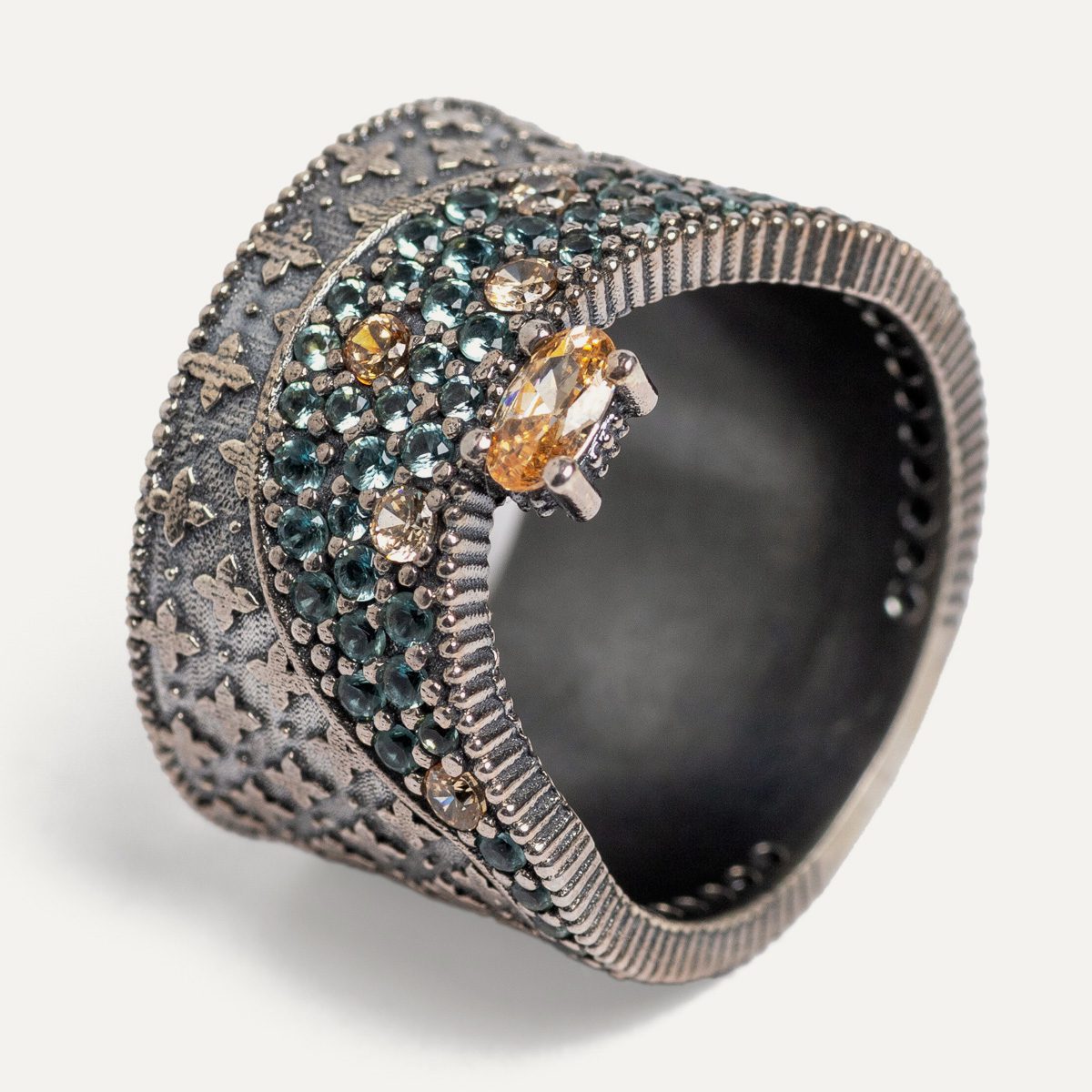 Bracelet en argent 925 avec agates, perles de verre, zircons et nylon. Au centre, un détail en argent avec une finition antique et des pierres en zircone de turquoise et de turquoise taillées en brillant, serties à la main.