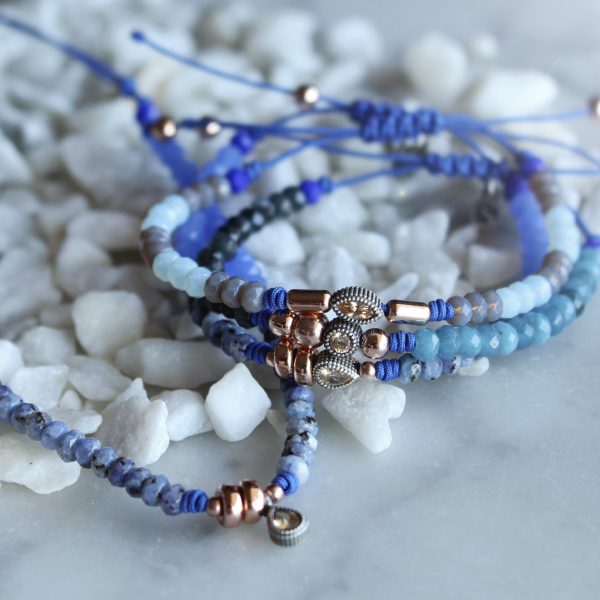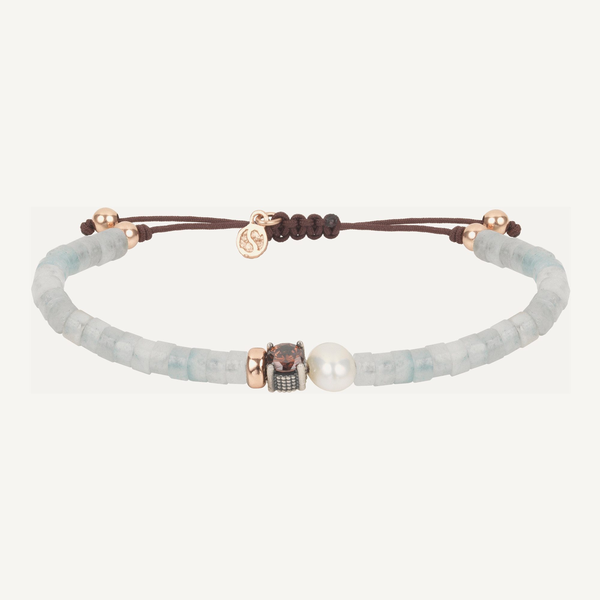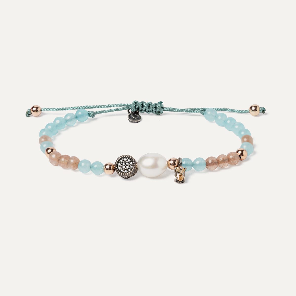 Les perles qui complètent l’ensemble sont en argent sterling plaqué d’or rose 24kt et se ferment à l’aide d’un fermoir macramé réglable pour plus de confort.