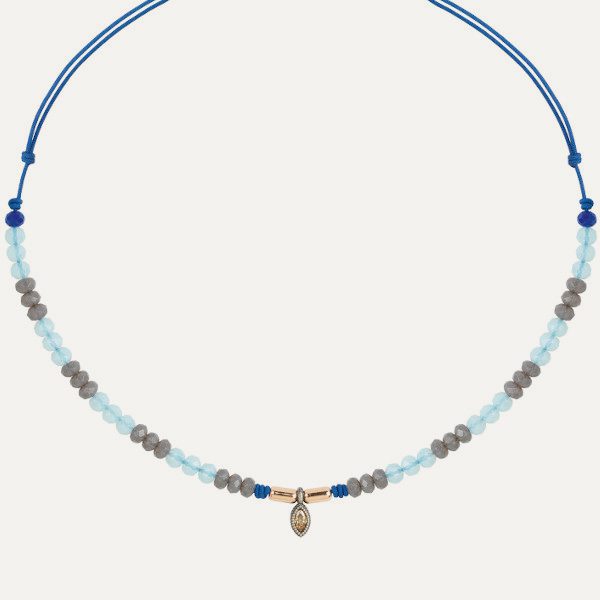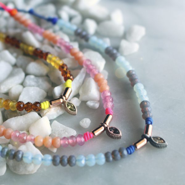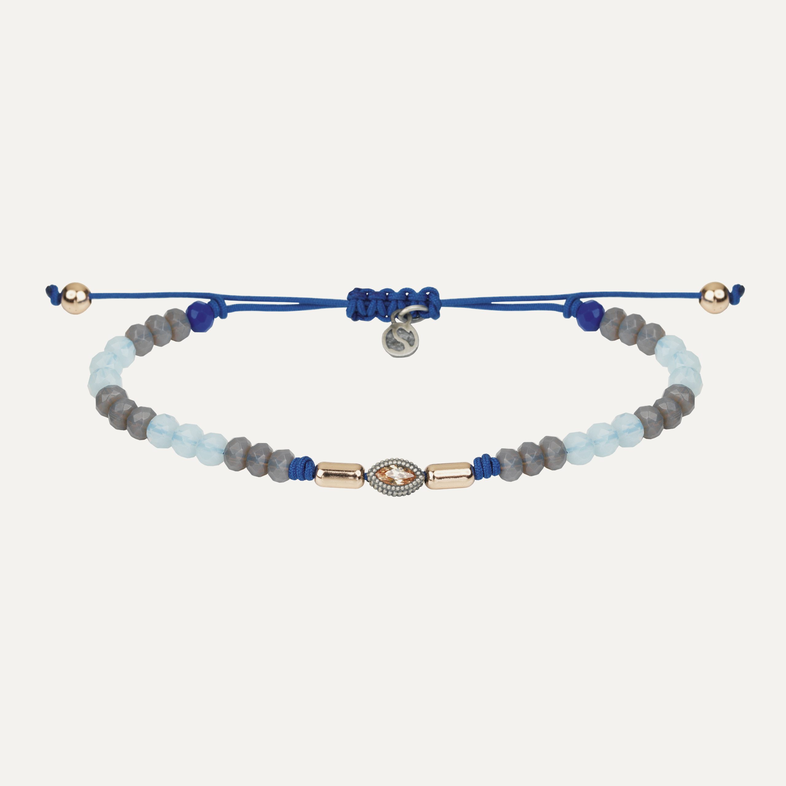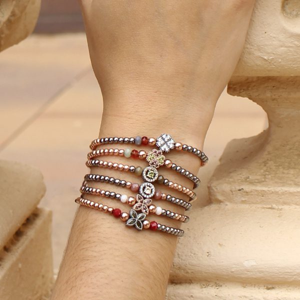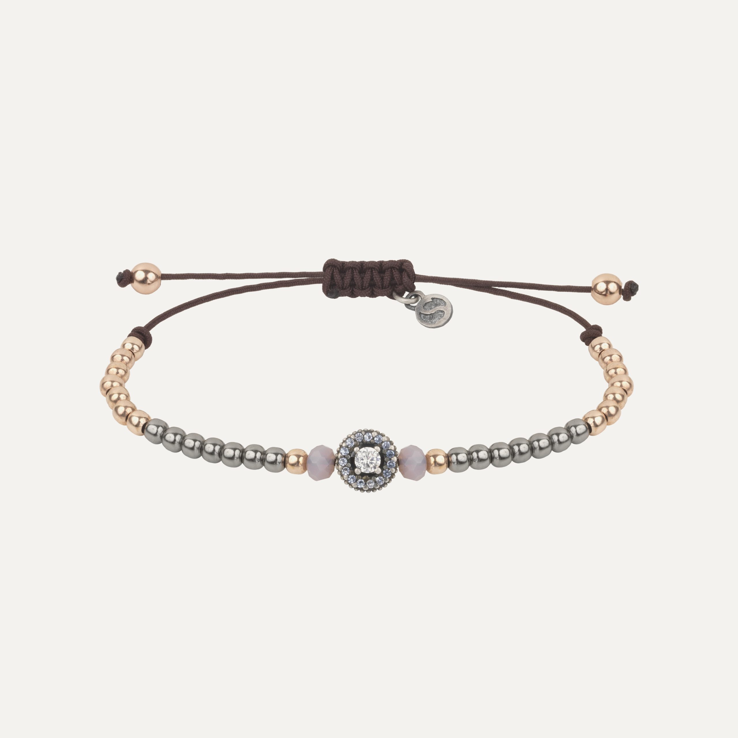 Les perles qui complètent l’ensemble sont en argent sterling plaqué d’or rose 24kt et se ferment à l’aide d’un fermoir macramé réglable pour plus de confort.