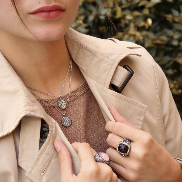 Le bracelet Sena présente un motif central en argent 925 avec un cabochon lisse de calcédoine de 3 mm et des zircons bruns de taille champagne et brillante. Le reste du bracelet est composé d’une combinaison de perles de verre et d’hématite grises et vertes. Il est monté sur un solide fil de nylon brun de longueur réglable.
