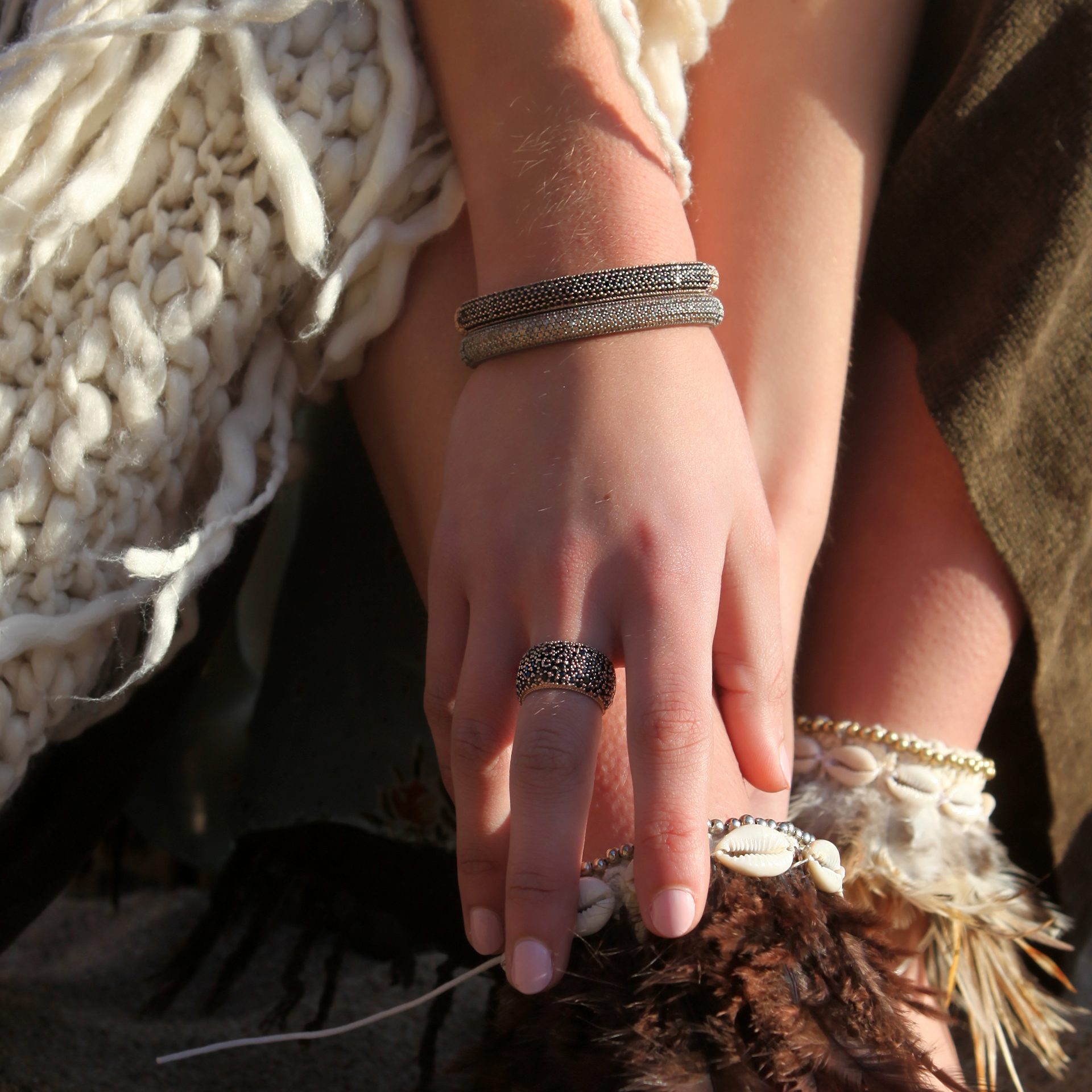 Le bracelet Tamariu de Sunfield joue avec les symétries des formes et combine avec élégance différents tons et textures. Il est assemblé avec un fil de nylon noir résistant et se compose d’un motif central hexagonal en argent rhodié noir et plaqué or rose 24kt de 17×17 mm orné de zircons champagne taille brillant. Il est réglable en taille.
