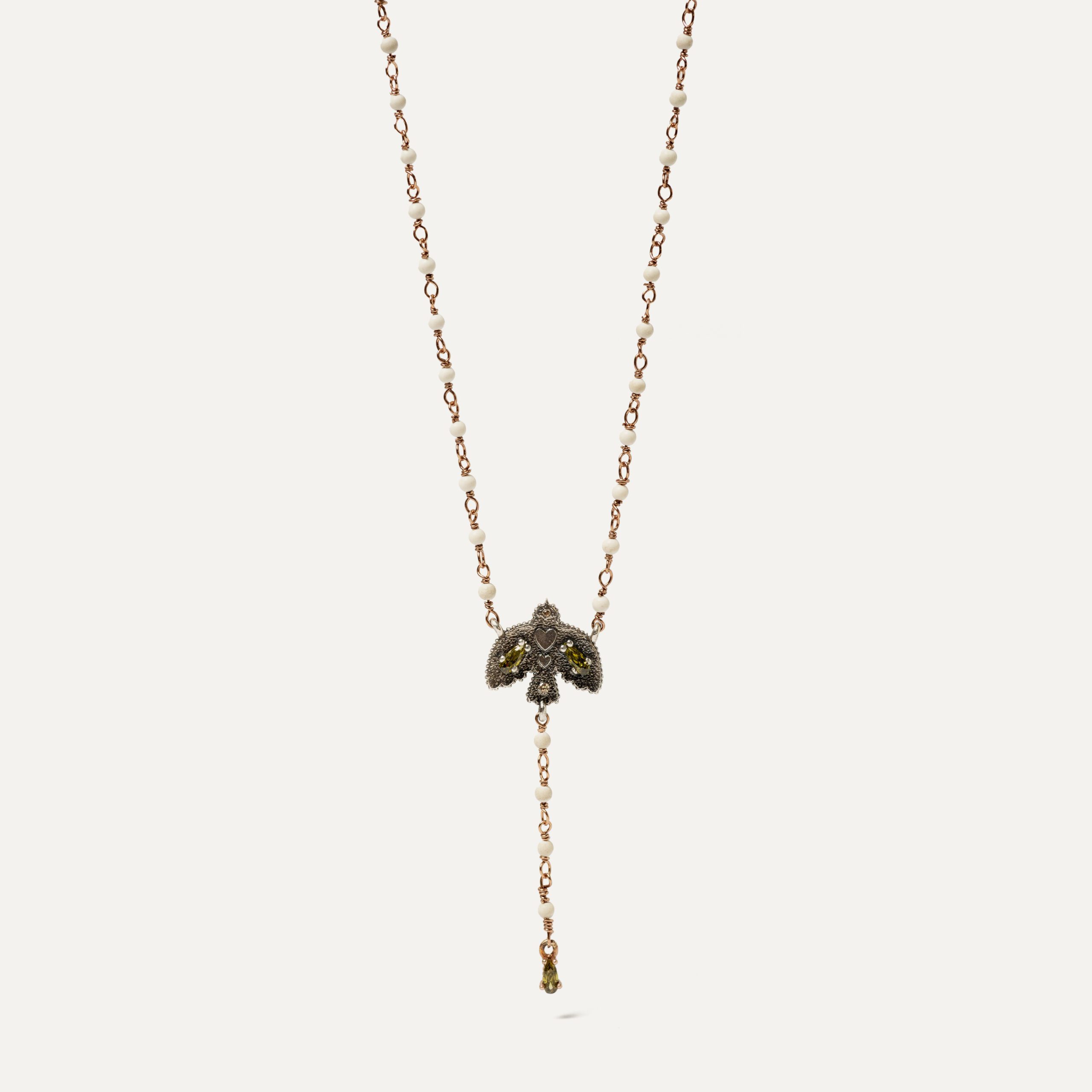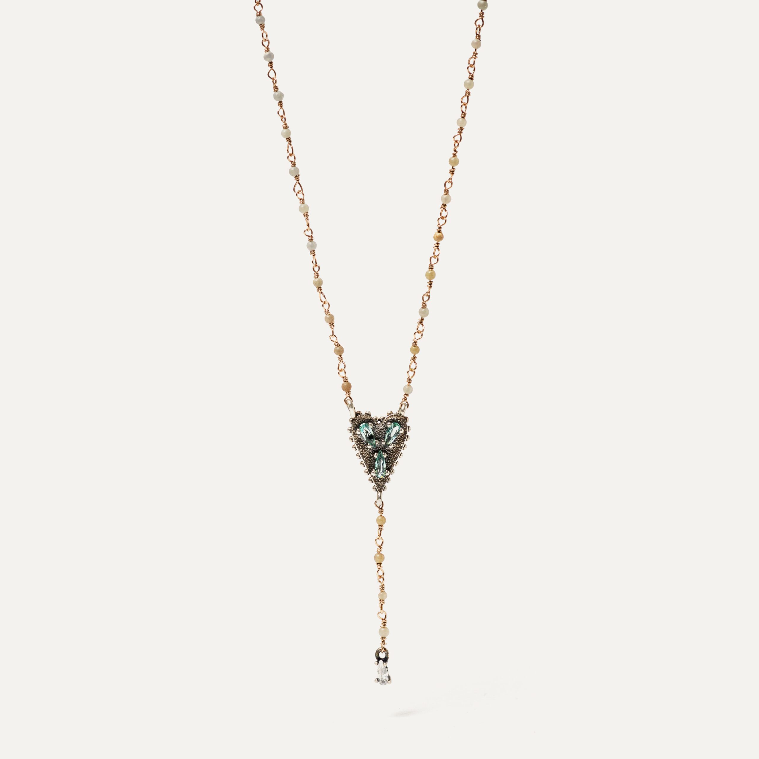 Il est réalisé en argent 925 et décoré de zircons de couleur cava, taillés en brillant, disposés dans une structure circulaire ornementale à la finition antique. Il est accompagné d’une double chaîne de 40 cm de long : l’une avec de fins maillons en ton or rose et l’autre en forme de chapelet avec des perles lilas, ce qui lui confère un air romantique et sophistiqué. Un design harmonieux et plein de détails, conçu pour vous accompagner dans les moments les plus spéciaux.
