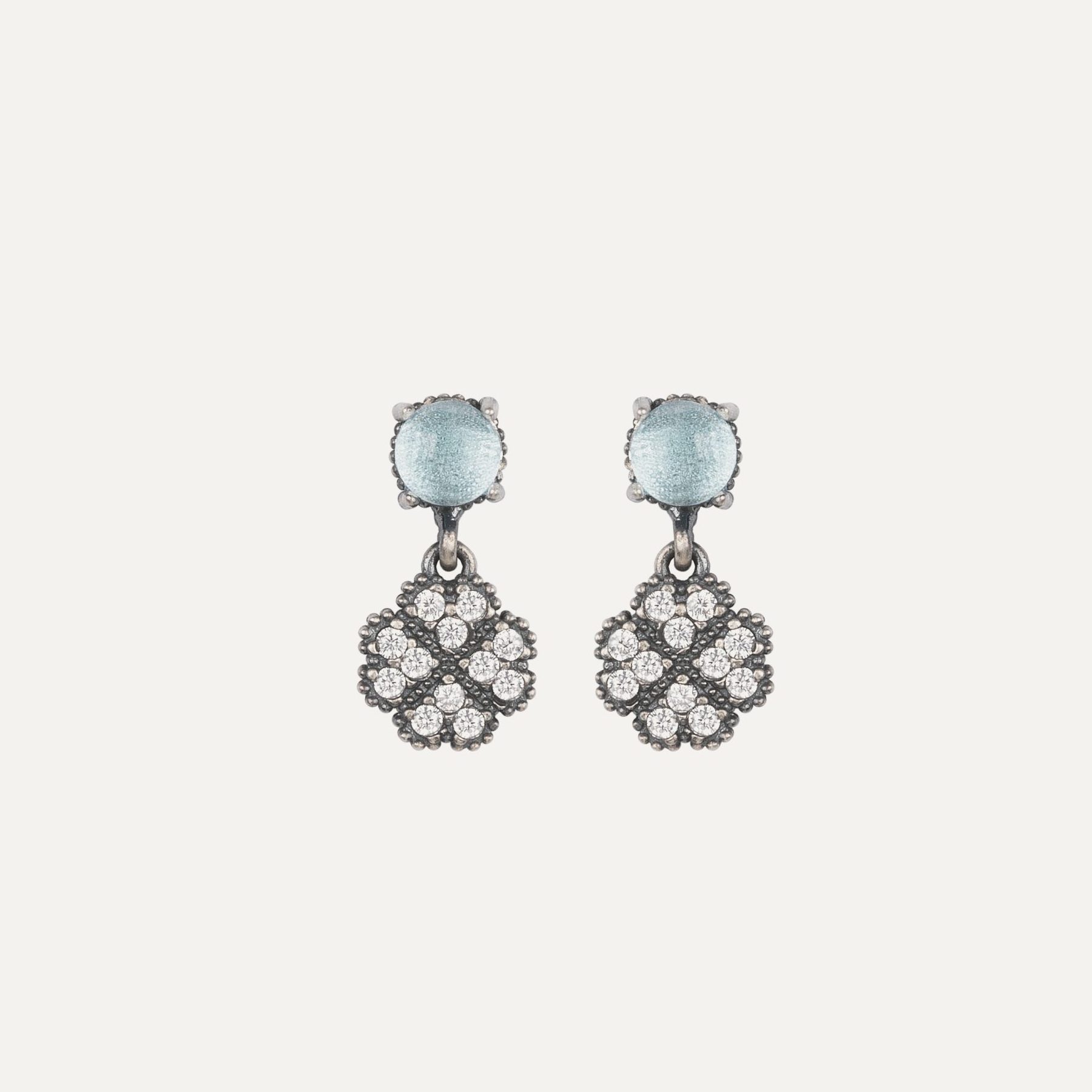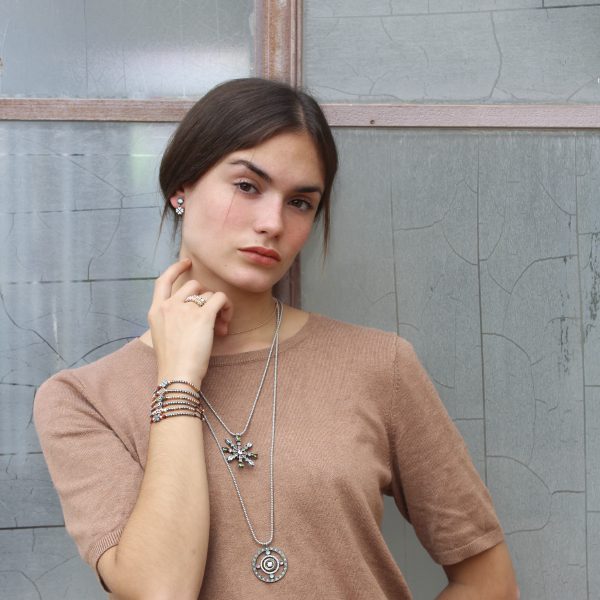 Les pendentifs Pigalle de Sunfield sont équilibrés, avec une touche romantique, voire ethnique, une combinaison différente et originale. Réalisés en argent 925, ils comportent un cabochon central de calcédoine lisse de 10 x 8 mm, accompagné de quatre cabochons lisses de 3 mm de diamètre en quartz rose et opale bleue. La touche finale est apportée par un zircon cubique blanc taillé en forme de goutte d’eau. Longueur de la chaîne : 42 cm.